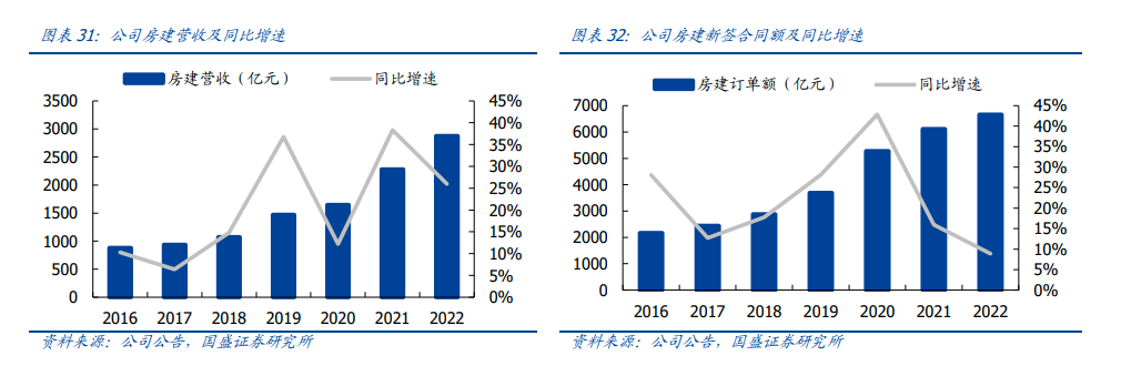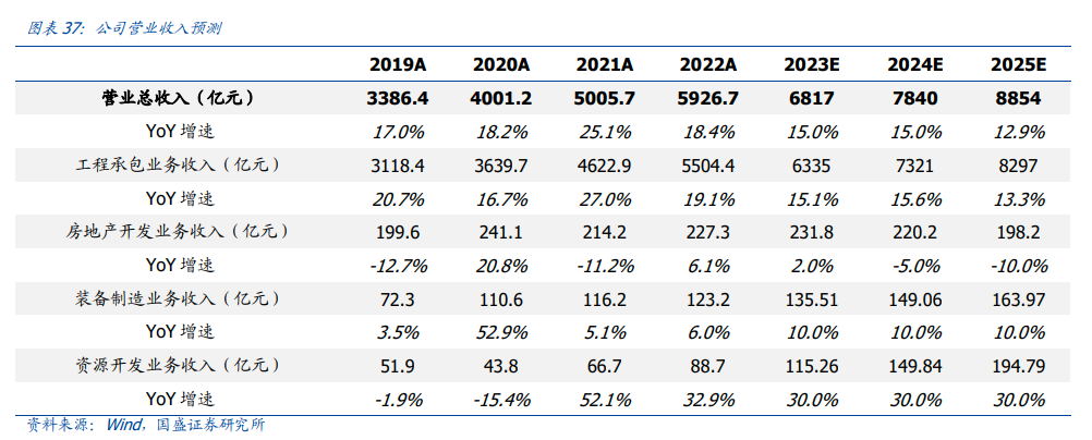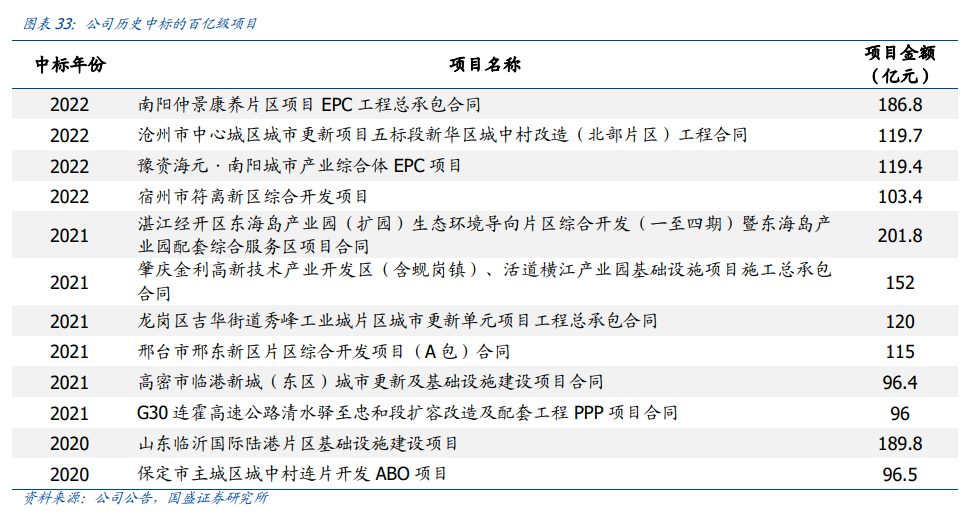投融一体模式筑造房建业务优势,落地多批大体量综合工程项目,房建、基建海外业务潜力巨大。近年来,公司通过不断深化与地方政府及大型企业等战略客户的合作,持续创新商业模式,灵活运用EPC+F、ABO、PPP等新型业务模式承接多个城市更新改造、片区整体开发等重大工程项目,已成功打通项目全生命周期内投融资、设计、建设、运营一体或多种业态组合的产业链。依托项目全产业链优势,公司自2020年起中标了多个百亿级大型项目,市场影响力不断提升,房建订单额延续高速增长态势,2022全年新签房建订单额6662亿元,同增9%;房建板块实现营收2874亿元,同比大幅增长26%。根据公司年报披露,2022年承接了长江黄石段生态环境导向开发(EOD)项目、2021年公司中标湛江经开区东海岛产业园(扩园)生态环境导向片区综合开发(EOD)项目,合同额超200亿元,创历史中标单项目规模最高。EOD项目模式自去年起开展试点,今年4月生态环境部正式印发《生态环保金融支持项目储备库入库指南(试行)》,要求推进适宜金融支持的重大生态环保项目谋划,建设生态环保金融支持项目储备库,并明确将生态环境导向的开发(EOD)模式项目列为支持对象。EOD模式分三个阶段进行:1)重构生态网络;2)整体提升城市环境;3)产业导入及人才引进,项目收益来源主要为土地溢价收入及产业反哺分成收益。EOD项目通常体量较大,且为政府主导类项目,项目模式以PPP、ABO、EPC+F为主,对企业资金实力、综合建设能力要求较高,中标企业多为建筑央企。后续政策驱动下,相关项目体量有望高增,公司已打造项目投融建运一体全产业链布局,在EOD等大型项目承接上具备显著优势,随项目大型化、综合化趋势持续推进,公司房建订单有望延续稳健增长。公司精准优化房建业务营销结构,重点向超高层、大型综合体、高端房建等细分领域发力,2022年公司成功中标了广州国际金融交易广场、邢东新区高铁站前商务中心、茂名市奥林匹克体育中心、北京协和医学院天津医院项目二期扩建EPC等一系列高端房屋建筑项目,房建业务的合同结构得到进一步优化。公司房建海外业务潜力较大,蕴含巨大市场机会和增量空间。