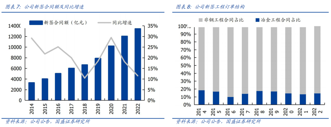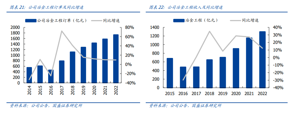 冶金技术实力领先,大型冶金工程国内市占率达90%。根据公司年报披露,公司是全球最大最强的冶金建设承包商和冶金企业运营服务商,在国内市场,环保原料场、焦化、烧结及球团、炼铁、炼钢及连铸、热轧扁平材、热轧长材和冷轧业务领域的技术水平、工程业绩、建设效果、业主满意度方面均处于领先地位。在市场开拓方面,公司注重发挥全产业链优势,可为客户提供一揽子解决方案,承接了众多主要钢铁企业的大中型项目,占据国内90%、全球60%的冶金市场,竞争优势突出。冶金订单、收入持续高增。2016年起随着国家供给侧改革深入推进,钢铁行业盈利大幅改善,钢铁公司资本开支能力及意愿显著增加。在产能减量置换带动下,行业大型EPC订单明显增多,公司冶金订单自2017年起连续实现快速增长。2022全年公司累计新签冶金订单1730亿元,同比增长9.6%,创2013年以来新高。收入方面,全年公司冶金板块实现营收1296亿元,同增12.5%,延续高增态势。