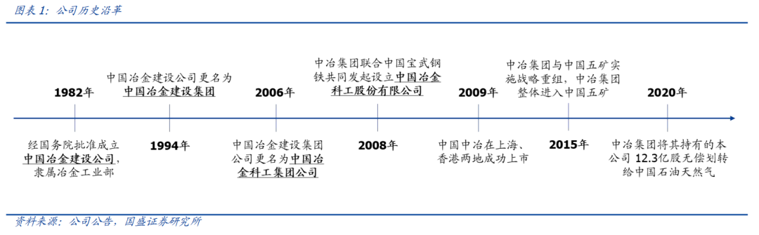 公司前身为1982年国务院批准成立的中国冶金建设公司,隶属冶金工业部,是专门负责海外工程市场开发运作的窗口公司。1994年,经贸委和冶金部以中国冶金建设公司为核心,将部属的部分设计院、勘察院和施工企业以企业联合体的形式组建了中冶集团。中国中冶于2008年由中冶集团联合宝武钢铁共同发起设立,并于2009年在上海、香港两地成功上市。公司在建立初期先后承担了国内几乎所有大中型钢铁企业主要生产设施的建设工程,是中国钢铁工业的建设主力军。经多年发展,中冶集团已成为全球最大的冶金建设承包商和冶金企业运营服务商,在国内钢铁市场占据绝对龙头地位。2016年,公司提出“做冶金建设国家队、基本建设主力军、新兴产业领跑者,长期坚持走高技术建设之路”的发展战略,立足冶金传统业务优势的同时积极发展建筑工程、资源开发、装备制造及地产开发板块,预期打造“四梁八柱”协同发展的多元业务布局。
