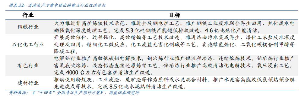 “双碳”目标下政策大力推进重点行业清洁低碳改造,钢铁等重点行业改造工程需求有望明显增长。《2030年前碳达峰行动方案》明确提出“实施重点行业节能降碳工程,推动电力、钢铁、有色金属、建材、石化化工等行业开展节能降碳改造,提升能源资源利用效率”。2021年11月,发改委等十部委联合发布《“十四五”全国清洁生产推行方案》,文件指出推动能源、钢铁、建材、有色金属、石化化工等重点行业“一行一策”绿色转型升级,加快存量企业及园区实施系统性清洁生产改造,支持有条件的重点行业率先碳达峰。在重点行业选择100家企业实施清洁生产改造工程建设,推动一批重点企业达到国际清洁生产领先水平。细分行业来看:钢铁行业计划完成5.3亿吨钢铁产能超低排放改造、4.6亿吨焦化产能清洁生产改造;有色行业完成4000台左右有色窑炉清洁生产改造;建材行业完成8.5亿吨水泥熟料清洁生产改造。钢铁、有色、石油化工、水泥等行业后续清洁改造工程业务有望快速增长。钢铁行业超低排放改造拉动有效投资2000亿元。截至2022年底,全国共有2.07亿吨粗钢产能完成全流程超低排放改造并公示,4.8亿吨粗钢产能已完成烧结球团脱硫脱硝、料场封闭等重点工程改造,上述产能占全国总产能三分之二。2023年1-3月,又有约4000万吨粗钢产能完成全流程超低排放改造。据生态环境部测算,钢铁超低排放改造累计拉动社会有效投资约2000亿元,带动了环保及相关产业快速增长。