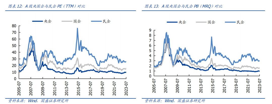 2. 估值催化:“国改与一带一路”加力,资源板块亟待重估2.1. “中特估值体系”恰逢其时,央国企市值动力有望增强中国特色估值体系对于提升国企股权价值有重要意义。证监会主席于2022年11月金融街论坛上提出,要“把握好不同类型上市公司的估值逻辑,探索建立具有中国特色的估值体系”。同年12月,上交所出台《中央企业综合服务三年行动计划》,从1)服务推动央企估值回归合理水平;2)配合国务院国资委开展央企专业化整合;3)积极服务完善中国特色现代企业制度三大方面提高央企控股上市公司质量。在地方土地财政面临较大压力,亟待寻找新收入渠道对冲土地财政背景下,推动国企估值回归到合理水平,提升国企股权价值,对于保障地方财政安全而言具有重要意义。上市国企市值大、估值低,股权价值提升空间大。从A股上市企业市值分布来看,央国企合计市值43万亿元,占比49%,市值规模在各类属性上市企业中最大。但央国企当前估值水平较低,截至2023/7/31,央企PE/PB分布仅9.7/0.98倍、地方国企仅15.5/1.60倍,明显低于民企的25.4/2.96倍;从估值历史走势上看,2006-2008年央国企可取得与民企相近的高估值,但2009年后央国企估值持续处于较低水平,向上修复潜力较大。