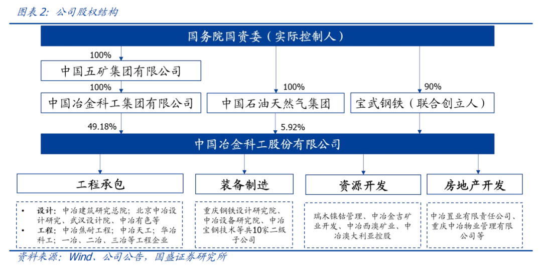 隶属五矿集团,国资委为实际控制人。截至2023Q1末,公司直接第一大股东为中国冶金科工集团有限公司(中冶集团),持股比例为49.18%,中国石油天然气集团于2020年5月接受中冶集团无偿划转公司股份约12.28万股,占总股份的5.92%。2015年12月,中冶集团与中国五矿集团经国务院批准实施战略重组,中冶集团成五矿集团的全资子公司,五矿集团由国资委直接监管,国资委仍为公司实控人。公司旗下子公司主要涉及工程承包、装备制造、资源开发及地产开发四大业务板块。