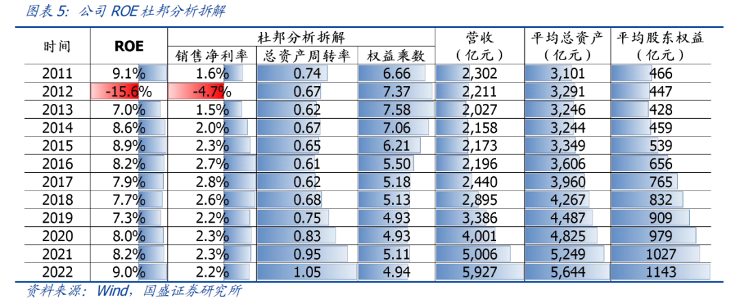 ROE企稳回升,盈利质量持续改善。公司净资产收益率自2012年降至低谷后逐年提升,由2013年的7.0%提高至2022年的9.0%。从杜邦分析看,净利率及总资产周转率提升为ROE改善的主要驱动力。公司ROE提高的同时资产负债率逐年降低,2022年公司资产负债率为72.3%,相较2012年大幅下降了11.5个pct,两金压降措施成效显著,资本结构持续优化。