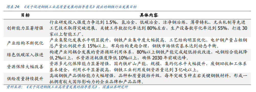 工信部等联合发布《关于促进钢铁工业高质量发展的指导意见》,进一步明确钢铁业低碳化、智能化发展路径。2022年2月7日,工信部、发改委、生态环境部联合发布《关于促进钢铁工业高质量发展的指导意见》,该意见为指引钢铁行业未来发展的重要纲领性文件,主要目标为:力争到2025年,钢铁工业基本形成布局结构合理、资源供应稳定、技术装备先进、质量品牌突出、智能化水平高、全球竞争力强、绿色低碳可持续的高质量发展格局。绿色低碳方面:要求构建产业间耦合发展的资源循环利用体系,80%以上钢铁产能完成超低排放改造,吨钢综合能耗降低2%以上,水资源消耗强度降低10%以上,确保2030年前碳达峰。智能化及创新方面:行业研发投入强度力争达到1.5%,氢冶金、低碳冶金、洁净钢冶炼、薄带铸轧、无头轧制等先进工艺技术取得突破进展。关键工序数控化率达到80%左右,生产设备数字化率达到55%,打造30家以上智能工厂。