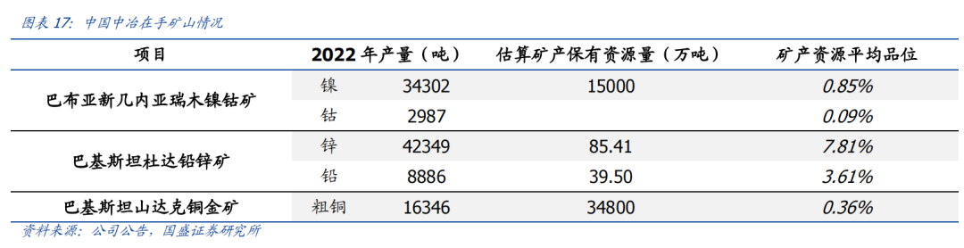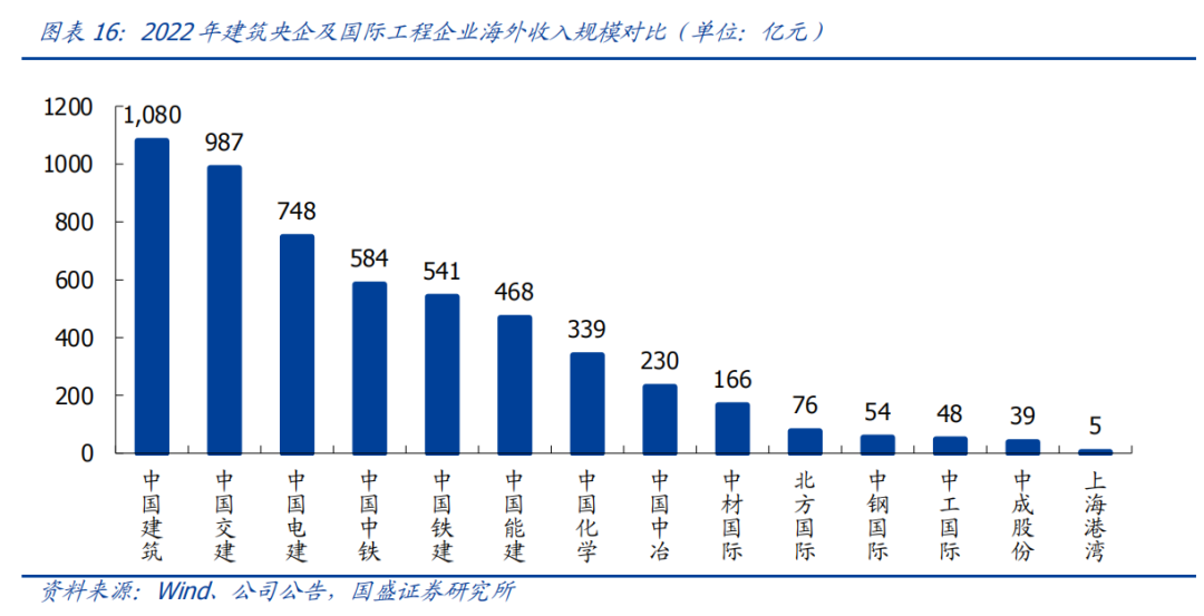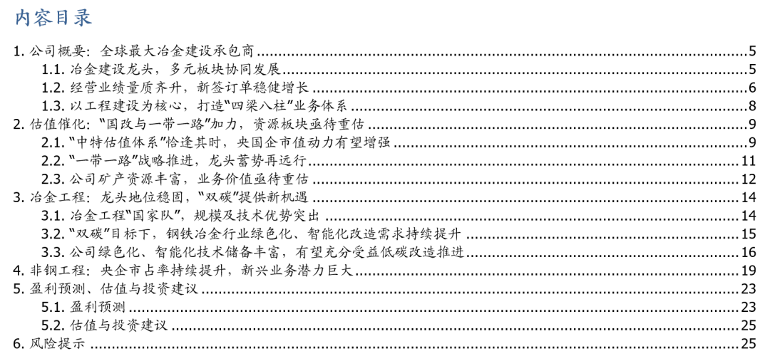央企海外收入规模领先,为工程出海领头羊。大型央企对外经济交往经验丰富,且在基础设施建设、高铁、核电等一些产业上已具有较强的国际竞争力。此外,在战略定位和主攻方向上非常明确,通常选择重点领域和国家或地区,并筛选重大项目,抵御风险能力也较高。从海外收入体量看,大型建筑央企海外业务规模大幅领先,作为我国“一带一路”主力军,建筑央企在传统电力、新能源、冶金、化工等专业工程领域具备显著优势,有望核心受益海外工程需求上行,同时有望给板块带来估值催化。冶金工程为我国传统优势产业,“一带一路”区域需求潜力大。钢铁行业作为中国制造优势产业,是扩大国际产能合作的重点领域,也是为“一带一路”基础设施互联互通提供原材料保障的基础产业。在全球钢铁需求增长整体趋缓的态势下,参与共建“一带一路”的东南亚、南亚、中东欧、西亚北非等地区和国家的钢铁需求仍具有较大增长潜力,部分地区正处于工业化加速发展期,基建和能源等装备制造发展带来大量钢材需求,冶金工程建设需求有望同步上行。中国中冶为全球最大的冶金建设承包商和冶金企业运营服务商,掌握智慧高炉冶炼、矿产资源开发、炼钢炼铁设备制造等领域关键技术和工艺,承建的钢铁项目占世界钢铁市场的63%以上,在世界近30个国家和地区有冶金建设项目,受益“一带一路”沿线项目推进,海外订单有望恢复较快增长。矿产储量丰富,资源板块有望贡献利润弹性。公司资源开发业务主要涉及镍、钴、铜、锌、铅等金属矿产资源的采矿、选矿、冶炼等领域。根据公司年报,公司旗下矿产资源主要有3座在产矿山,资源保有量丰富,项目开采期限可达20年。- 巴布亚新几内亚瑞木镍钴项目:是全球现有已投产红土镍矿中达产率和运营水平最高的矿山,该项目估算保有资源量1.50亿吨,镍平均品位0.85%、钴平均品位0.09%,折合镍金属量129万吨、钴金属量14万吨,基本可满足该项目平稳运行40年所需、产能翻番运行20年所需。