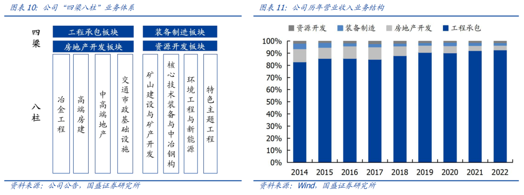 工程建设为公司核心主业,“四梁八柱”战略持续推进。公司主营业务分为工程承包、房地产开发、装备制造及资源开发四大板块,2022年营收占比分别为92.9%/3.8%/2.1%/1.5%,工程承包业务贡献主要收入。公司提出应以四大核心业务为“梁”、以冶金工程、高端房建、中高端地产、交通市政基础设施、矿山建设与矿产开发、核心技术装备与中冶钢构、环境工程与新能源、特色主题工程为“柱”,打造“四梁八柱”的综合业务布局,随“四梁八柱”战略逐步推进,公司业务结构有望持续多元。分地区看,2022年约96%的营收来自于中国大陆。