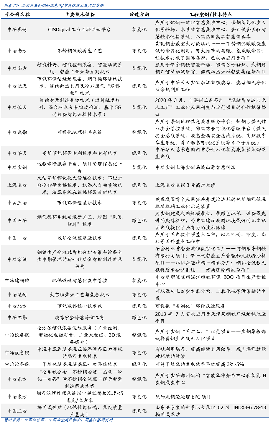 绿色低碳改造技术实力雄厚,旗下中冶京诚中标全球首例氢能源开发利用示范项目。近年来公司持续推进冶金领域的智能化、绿色化、低碳化及高效化发展,在钢铁主体单元和绿色化、智能化等系统集成工程技术上已达到国际领先水平。公司下属研究设计院储备有焦炉绿色化改造、烟气循环烧结、烧结余热利用等多个标志性钢铁节能减排改造技术,多项技术已实现项目级应用。根据公司年报披露,旗下中冶京诚于2020年中标了全球首例氢能源开发利用示范项目——河钢氢能源开发和利用工程示范项目设计。该项目将从分布式绿色能源利用、低成本制氢、气体净化、氢气直接还原、二氧化碳脱除和深加工、水处理等全流程和全过程进行创新研发,力图探索出一条世界钢铁工业发展低碳、甚至“零碳”经济的最佳途径。氢冶金是实现钢铁业低碳近零排放的核心技术路径,发展前景广阔。我国钢铁业经连续多年的节能改造和环保投入,吨钢综合能耗已有明显下降,2020年全国吨钢综合能耗约539kg标准煤,相较2015年降低6%。但在当前的工艺技术装备下,吨钢能耗进一步下降的空间有限。钢铁业若要实现大幅碳减排,需从根本上改变以煤冶金的冶炼工艺。氢冶金通过将氢气代替煤炭作为高炉的还原剂,能够大幅降低甚至完全避免钢铁生产过程的碳排放(传统工艺下生产1吨钢平均排放1.8吨二氧化碳)。“以氢代煤”是钢铁业低碳转型的重要发展路径之一,政策端已出台多项规划推动其发展。2月7日发布的《关于促进钢铁工业高质量发展的指导意见》提及应“加强对氢能冶炼、非高炉炼铁以及碳捕获、利用与封存等低碳冶炼技术的研发应用力度”。3月23日,发改委、能源局联合印发《氢能产业发展中长期规划(2021-2035年)》,将氢能定位为“未来国家能源体系的重要组成部分”、“用能终端实现绿色低碳转型的重要载体”及“战略性新兴产业和未来产业重点发展方向”。该规划提出,应逐步探索工业领域替代应用,拓展清洁低碳氢能在化工行业替代的应用空间,开展以氢作为还原剂的氢冶金技术研发应用。政策驱动下,制氢、储氢、氢气冶炼等工艺的研发进程有望明显提速,随技术不断成熟,行业有望迎快速发展期。