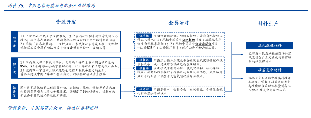 新能源工程:发力高技术新兴领域,旗下子公司技术储备丰富向光伏、风电、水电为代表的新能源产业转型,市场开拓成效显著。新能源产业发展的重点将向以光伏、风电、水电为代表的新能源产业转型,利好政策与行业需求双效叠加,新能源发展将持续提速。公司积极把握能源转型与低碳经济的新机遇,加速发展光伏、风能等清洁能源建设业务,在实现自身业务发展的同时积极推动国家“双碳”目标的实现进程。据年报披露,2022年,在光伏和风力发电方面,公司新签淮南大通区孔店乡渔光互补光伏发电项目、韶钢光伏项目(厂房一期)EPC总承包、华润中卫沙坡头区新井沟50MW分散式风电项目主体工程、照旺新能源乌拉特中旗巴音乌兰源网荷储一体化50MW风储供热项目等大型项目;在水电领域,新签秦创原•水光智造产业基地项目设计采购施工总承包等大型项目,业务开拓进展顺利,市场份额不断提升。旗下恩菲新能源技术实力雄厚,打造新能源金属全产业链潜力大。公司下属全资子公司中国恩菲新能源前身系成立于1953年的原中国有色工程设计研究总院,在有色矿冶领域具备领先技术优势。矿产资源端,中国恩菲持续引领矿山工程技术发展,承接多项锂、镍、钴等新能源矿产资源开采工程,工艺技术水平业内领先。冶炼端,公司已形成了涵盖镍、钴、锂等新能源基础材料战略资源的冶炼及电池材料制备的综合业务体系并推动和承担了相关领域的标准、规范编制工作,行业地位突出。材料端,公司具备以低成本精炼获得的溶液直接生产三元正极材料前驱体的短流程技术,可实现产业链前端冶炼与后端材料制备的紧密结合。多端布局一方面有望扩大公司新能源工程业务规模,另一方面有望将公司资源板块业务向下游延伸,打造从资源开发、金属冶炼到材料制备的新能源基础材料全产业链布局,业务前景广阔。