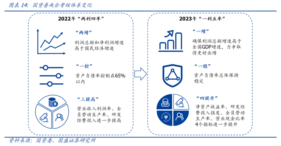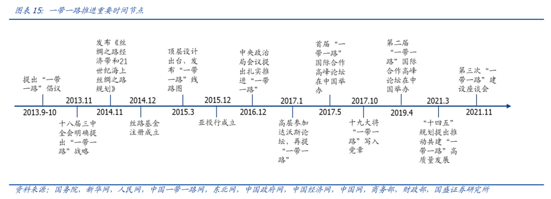 细化政策持续出台,引导央国企经营质量提升,增强市值动力。近期国资委召开中央企业负责人会议明确,2023年中央企业“一利五率”目标为“一增一稳四提升”,相较2022年“两利四率”的考核体系和“两增一控三提高”的目标,2023年国资委新增ROE和营业现金比率作为央企考核指标,有望引导国央企淡化规模,追求实际的经营质量提升。此轮考核体系更贴近资本市场标准,有望使监管和市场重要利益相统一,更好激发国有上市公司价值重估和回归。同时,在新一轮国企改革推动下,预计未来更多央国企将出台股权激励措施,期权、分红、科技成果转化分享等更多元激励方式有望落地,市值动力有望进一步增强。新时代“一带一路”战略意义提升,十周年蓄势向前。“一带一路”倡议于2013年提出,2017年10月写入党章,战略重要性凸显。作为国家重点高层战略之一,“一带一路”在新时代将被赋予新的重要意义:一方面有利于我国进一步加强和稳固周边国家合作,维持区域稳定,保障中国国家安全;另一方面有望更好推动国内国际双循环战略实施,加速国内优势产能输出,未来有望加力推进。2017年、2019年我国先后两次召开“一带一路”高峰合作论坛,在政策沟通、设施联通、贸易畅通、资金融通、民心相通5大方面取得了丰硕成果。2023年我国考虑举办第三届“一带一路”高峰论坛,又恰逢“一带一路”提出十周年,具有里程碑意义,有望推动更多合作协议及支持政策落地。基建工程作为中国强项,具备全球竞争优势,是一带一路合作推进的重要载体,预计在相关政策推动下,海外工程需求将加速恢复。