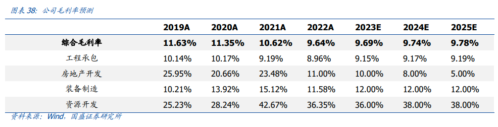 收入:公司为冶金工程龙头,主业竞争优势稳固,非钢工程/资源开发等新兴业务快速增长,中长期成长动力充足。根据公司在手订单及各业务发展情况,我们预计公司工程承包主业与装备制造业务将维持稳健增长;资源开发业务有望延续较高增速;房地产开发业务受地产行业整体景气度低迷影响,或将略有收缩,预计2023-2025年公司整体营业收入分别为6817/7840/8854亿元,分别同比增长15.0%/15.0%/12.9%。毛利率:受益于业务结构优化,工程承包业务盈利能力有望逐步提升;考虑到房地产市场压力仍存,预计房地产开发业务毛利率呈下降趋势;资源开发业务受下游需求驱动,利润率有望进一步提升;假设装备制造板块毛利率保持相对稳定,综合影响下,我们预计公司2023-2025年综合毛利率平稳略升,分别为9.69%/9.74%/9.78%。费用率:考虑到2023年境外业务与新兴产业加力拓展,销售与管理费用率或有小幅提升,后续趋于平稳;假设财务与研发费用率保持相对稳定,预计2023-2025年公司期间费用率分别为6.0%/5.9%/5.9%。归母净利润:基于上述分析,我们预计公司2023-2025年归母净利润分别为121/140/158亿元,同比增长18.1%/15.1%/13.1%。