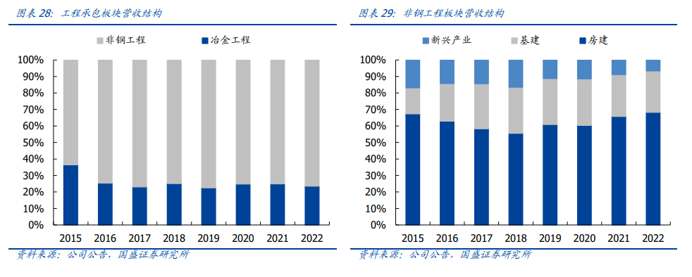 1)工程承包业务:公司工程承包业务由冶金工程和非钢工程建设业务组成,非钢工程主要包含房建、基建及新兴产业领域。2022年,冶金及非钢工程收入占工程承包总收入的比例分别为24%/76%,非钢工程中房建/基建/新兴产业的占比约为68%/25%/7%。公司新兴产业领域主要涉及生态环保、特色工程、康养、新能源及检验检测五大板块。