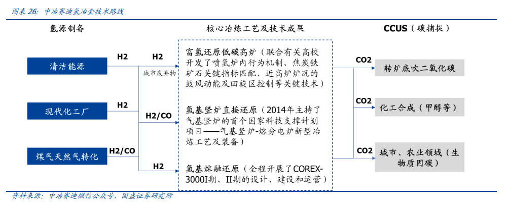 下属中冶赛迪研发低碳冶金十余年,已具备氢冶金完全自主知识产权。中冶赛迪自2008年起开展低碳冶炼工艺研究,在全氧高炉富氢喷吹、煤气循环、气基非高炉炼铁、绿色高效电弧炉炼钢等绿色低碳新工艺及核心装备方面开展了大量技术研发,技术成果丰硕。在氢冶金领域,中冶赛迪提出以“氢能制备→氢能冶炼→CCUS(碳捕捉)”为主线,通过富氢还原低碳高炉、氢基竖炉直接还原、基于高效预还原的氢基熔融还原三大技术路径,实现绿色低碳氢冶金的技术路线图。截至目前,中冶赛迪已针对氢冶金技术路线各环节开展了多项研究,掌握了我国钢铁工业在绿色低碳氢冶金技术领域的完全自主知识产权。2020年10月,中冶赛迪与天津荣程钢铁、东北大学等单位签订氢冶金战略联盟,致力于建设全球首个基于钢化联产的氢冶金示范钢厂。根据中冶赛迪制定的减碳路线图:预计到2030年,实现富氢还原低碳高炉减少CO₂排放≥35%、氢基直接还原减少CO₂排放≥60%的目标;通过未来进一步开展碳捕集利用技术(CCUS)初步实现零碳冶炼。目前,中冶赛迪已与多家骨干钢铁企业开展高炉喷氢、氢基竖炉等项目合作,后续有望加速氢冶金技术国产化落地进程。技术实力+客户资源业内领先,有望充分受益行业绿色、智能化发展。公司作为冶金工程龙头在细分市场市占率高(国内大项目市占率达90%),客户资源丰富(服务绝大多数钢铁企业),在钢铁节能减排、提标改造、智能升级的技术储备与实施能力突出,短期看有望充分受益钢铁业节能降耗改造需求增长。长期看,双碳目标约束下,以氢冶金、CCUS等技术为核心的低碳冶炼技术有望替代传统煤炭冶金工艺。公司相关技术储备及研发成果丰富,当前已中标首例氢能源开发利用示范项目,有望持续引领氢冶金行业发展,稳固冶金工程龙头地位。