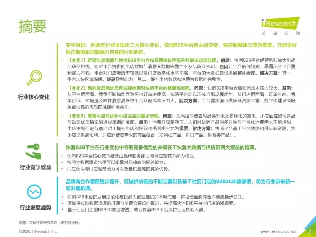 报告对快消品B2B行业发展中的核心变化及新机遇的把握进行系统地研究。通过行业三大核心变化以及相应行业问题的系统分析,指明行业问题的解决路径。基于此,构建快消品B2B行业的竞争优势分析框架,助力快消品B2B平台更好地在行业变革中建立适合自身禀赋的竞争壁垒,抓住行业深度调整创造的新一轮发展机遇,建立稳健的盈利模式,进而提升自身的行业地位。