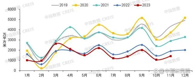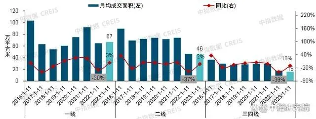 重点100城:2023年1-11月,重点100城新建商品住宅成交面积同比下降约5%,绝对规模为2016年以来同期最低水平。据初步统计,2023年1-11月,重点100城新建商品住宅月均销售面积约2861万平方米,同比下降4.6%。具体来看,受疫情后需求集中释放带动,年初市场升温明显,叠加低基数效应,1-4月销售面积同比增长23%,年中量价出现回落,市场表现低迷,8月末以来,多个核心城市陆续落地执行“认房不认贷”、优化限购和限售政策,政策环境已接近2014年最宽松阶段,但居民预期仍未能明显改善,政策带动效果较为有限,9、10月重点城市销售面积环比小幅回升,但同比仍有较大降幅。进入11月,购房者置业情绪继续走弱,重点城市销售面积环比下降约8%,同比下降约14%,年末市场仍旧面临下行压力。