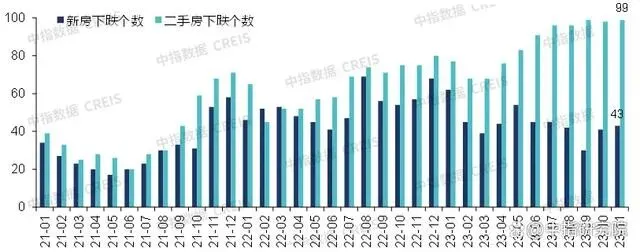 从涨跌城市个数看,2023年1-11月,新建住宅价格累计下跌城市数量为64个,月度环比下跌城市数量基本保持在40-50个的区间。1-11月,二手住宅价格累计下跌城市数量为97个,价格环比下跌城市数量则呈先降后升态势。3月,二手住宅价格环比下跌城市数量下降至68个,4月起下跌城市数量整体呈持续增加态势,11月百城二手住宅价格环比下跌城市数量增至99个,已连续6个月超90城,二手房价格呈普跌态势。