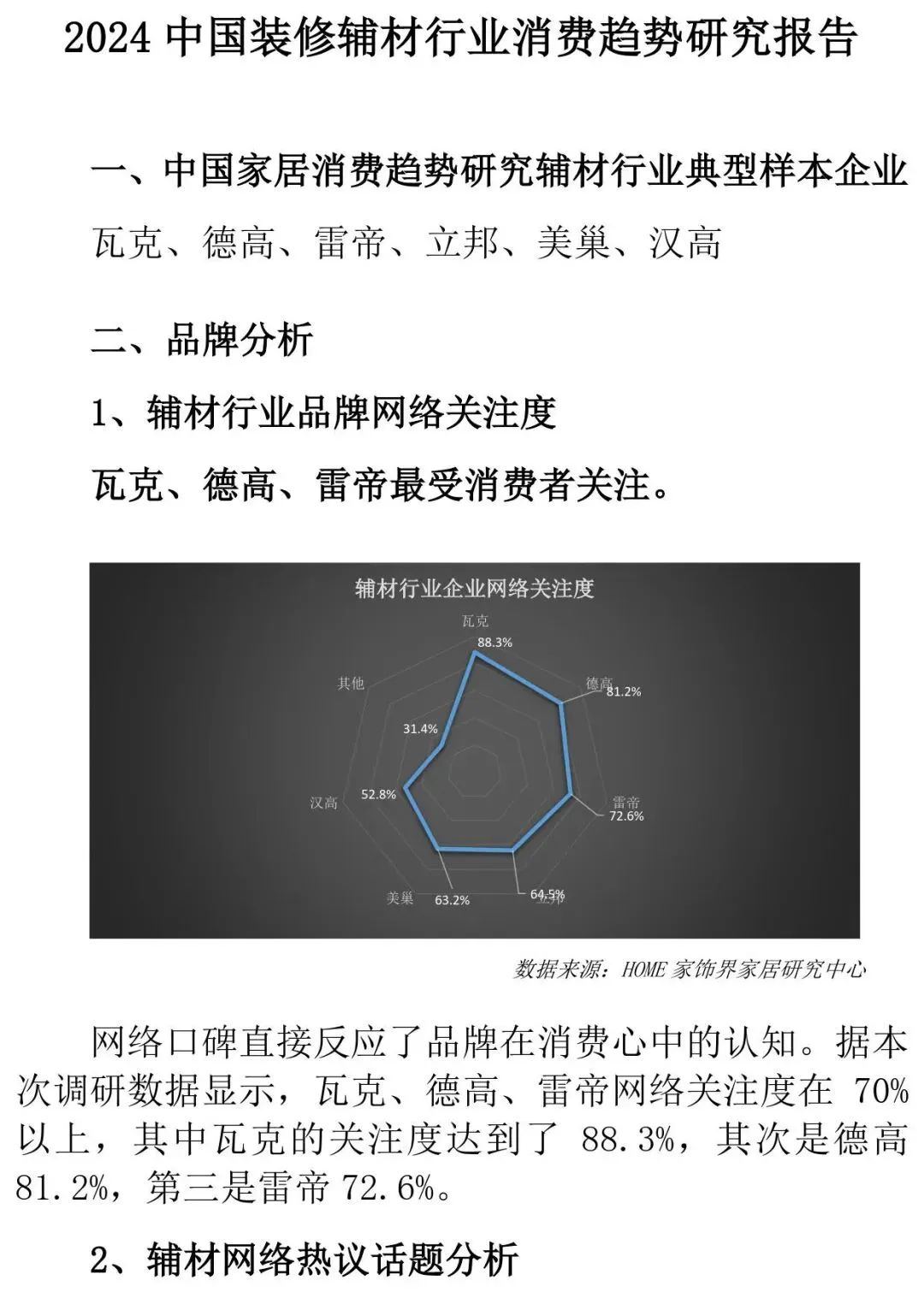 声明:本报告是基于消费者、业内人士、企业、行业协会、各受助单位或组织、各网站和媒体平台、企业经销商、家居卖场、设计师等公开披露的信息为核心依据的独立第三方研究,所载内容及观点客观公正。我们仅对我们采集的样本负责,但不保证网络公开数据的准确性及完整性。