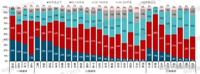 从成交面积段来看,90-120平方米产品仍是新房市场需求主力。与上年同期相比,30个代表城市中,16个城市120平方米以上新房成交套数占比提升,18个城市120-144平方米成交套数占比有所增长,其中合肥、西安、成都等核心二线城市增加明显。另外,随着越来越多的新房产品定位于满足改善性住房需求,30个代表城市中半数城市90平米以下面积段产品成交占比下降。