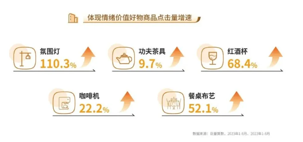 在居家生活中,大到一个房间,小到一个物品,除了它的本身功能属性外,也能体现出它背后内涵价值的表露。例如,氛围灯是一盏灯,但它的重点则是烘托的氛围;红酒杯是一个杯子,但它透露出来的优雅和格调是普通杯子无法替代的,二者在抖音上商品点击的增速分别为110.3%、68.4%。除此以外,诸如咖啡机、功夫茶具等物品已经超越本身的功能价值,其代表的仪式感也成为用户情绪价值的源泉。