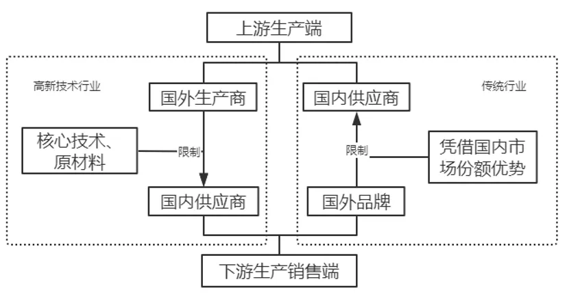 在高新技术产业,因为技术限制、原材料短缺等问题,国货品牌的生产销售制造阻碍,如芯片、操作系统对国产手机生产的影响。而在传统行业,此次“新疆棉事件”却用相反的逻辑,凭借下游销售终端品牌在国内市场的优势,逼迫上游厂家更换供应商,影响上游原材料的生产与出口。