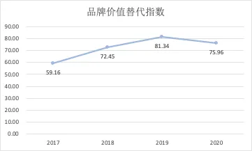 从图7可以看出,2017-2020年,品牌价值替代指数趋势上升,且得分较高,说明相对于其他层面,品牌价值层面在这几年对国外品牌有很好的替代效应。一方面,国货品牌在国内出现新冠疫情等灾害时充分体现了民族品牌的社会担当,捐款捐物,获取了消费者的好感与支持,也扩大了品牌的影响力;另一方面,国外品牌在一些原则性问题上多次让国内消费者失望,而当前消费领域的主力军正是爱国情绪高涨的年轻群体,这些因素天然使国货品牌在消费群体中的影响力明显提升,实现价值变现。