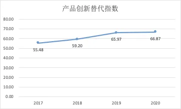 如图5所示,2017-2020年快消品行业国货品牌的市场竞争替代指数趋势上升,在2018-2019年有较大的飞跃,2020年略微下降。在市场竞争替代层面,运动服饰与化妆品细分赛道增长明显,安踏在这四年间完成市场份额翻倍的任务,完美日记等国产化妆品牌也迅速扩张,顺利上市。在2020年双十一中,国产品牌元气森林首次超越长年“霸榜”的国际品牌,同时斩获天猫和京东水饮品类销量第一;主打“无尺码、无钢圈内衣”的国货内衣Ubras挤掉优衣库,登顶天猫内衣榜单。由快消品行业市场竞争替代指数可见,国货品牌正在稳步抢占市场份额,形成规模效应,从市场上获取良性循环,强化国产替代能力。