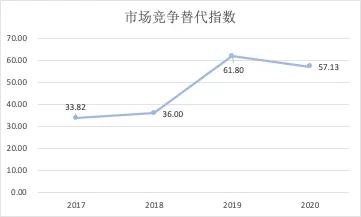 从图4可以看出,综合国产替代指数在2017-2020年间稳步上升,2020年与2019年基本持平,主要因为新冠肺炎疫情导致中国消费行为发生巨大改变,2020年前三季度,国内快消品市场销售同步增长几乎为零,而在此前连续3年其销售额增长逾5%,因此总的看来,国产替代指数逐年走高,反映了国货品牌对于国外品牌的替代能力也逐渐增强。