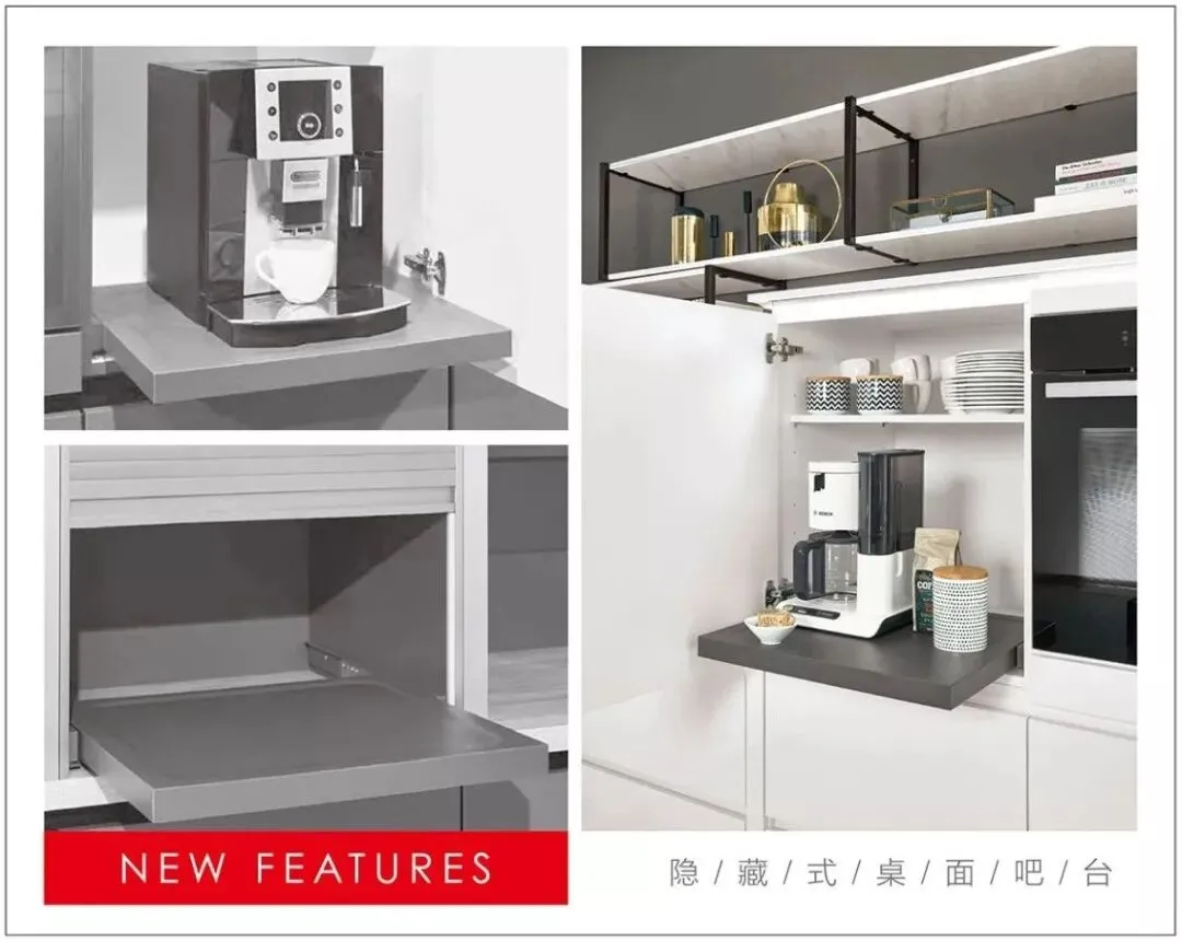 全新的隐藏式桌面吧台,以翻下门板即可另辟空间的巧妙设计,令有限空间满足多功能需求。
