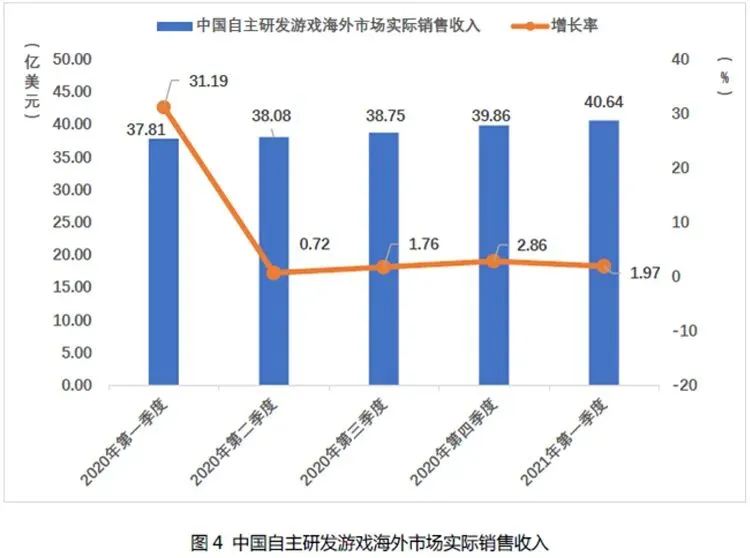 2021年第一季度,中国游戏厂商积极布局海外市场,中国自主研发游戏海外市场实际销售收入达40.64亿美元,环比增长1.97%,保持增长。