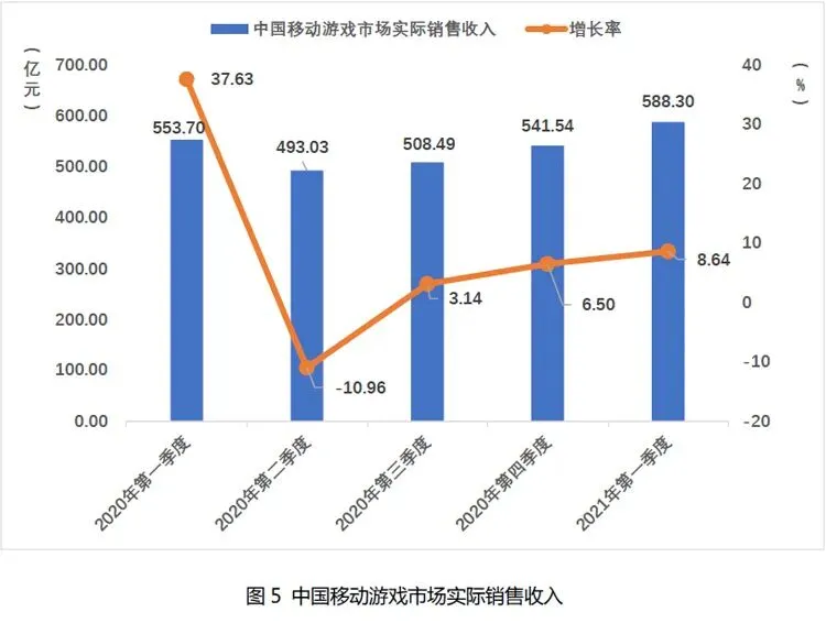 2021年第一季,游戏厂商积极举办元旦、春节相关活动,密集发布新产品,游戏供给丰富,市场活跃。2021年第一季度移动游戏实际销售收入与上季度环比增长8.64%,达到588.3亿元。