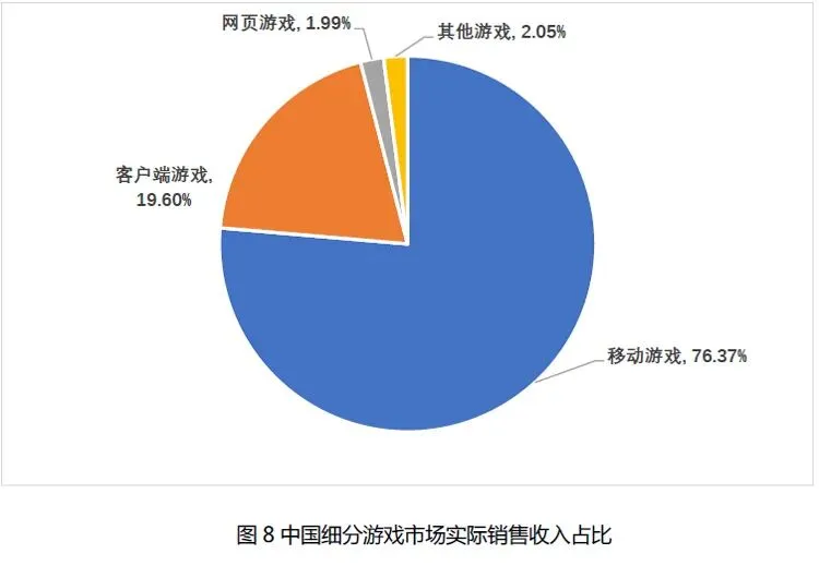 移动游戏的收入在整体收入中占76.37%,保持较高占比。网页游戏的占比持续下降,只有1.99%。