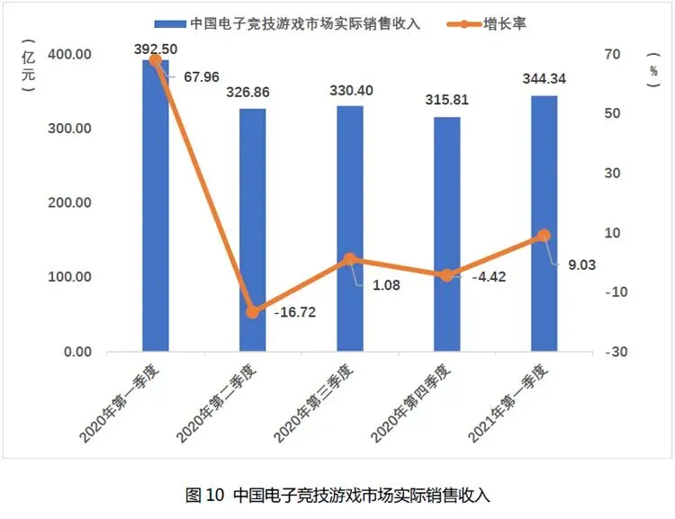 2021年第一季度,中国电子竞技游戏市场实际销售收入344.34亿元,环比增长9.03%。