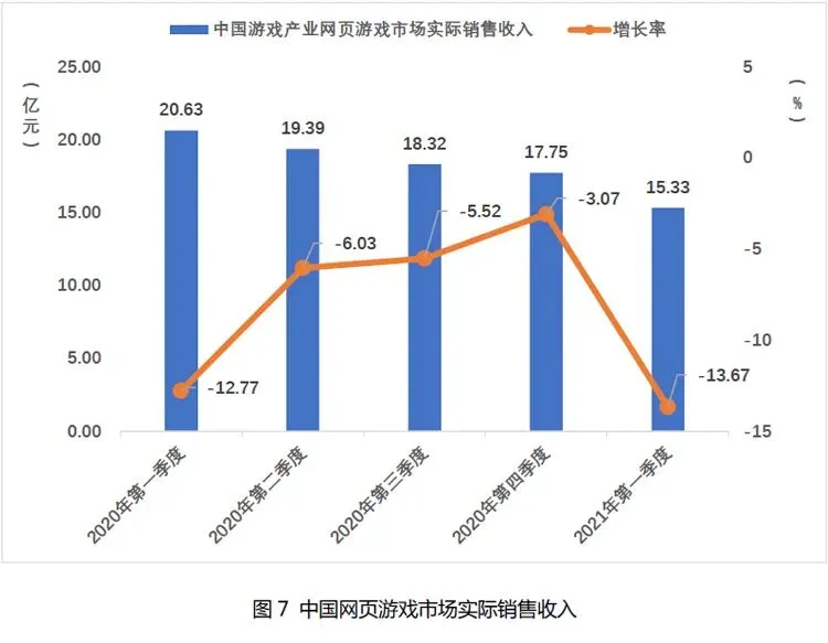 网页游戏市场近几年的相关研发和运营厂商快速减少,有向移动游戏转移的趋势,用户的娱乐需求意愿逐步下降。网页游戏市场实际销售收入从2020第四季度的17.75亿元减少至2021年第一季度的15.33亿元,环比下降13.67%。