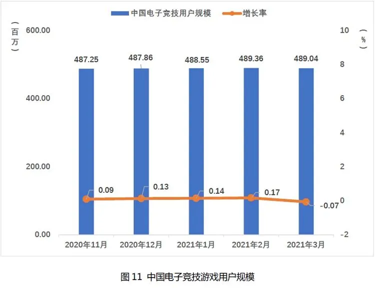 电子竞技游戏用户基本保持不变,2021年第一季度中国电子竞技用户规模达4.89亿人。