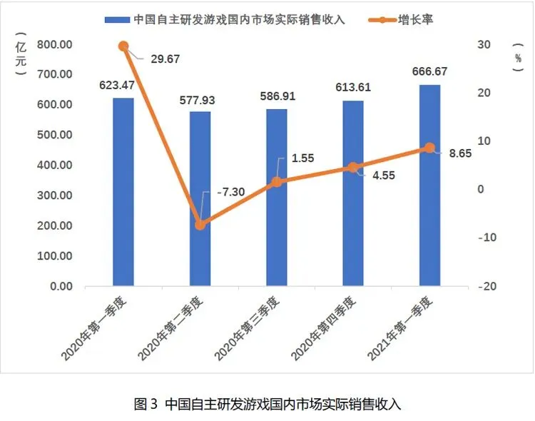 随着创作生态日益完善,中国游戏企业自主研发产品的平均质量不断攀升,在国内外的竞争力不断增强。2021年第一季度,自主研发游戏国内市场实际销售收入达到666.67亿元,相比2020年第四季度环比增长8.65%。