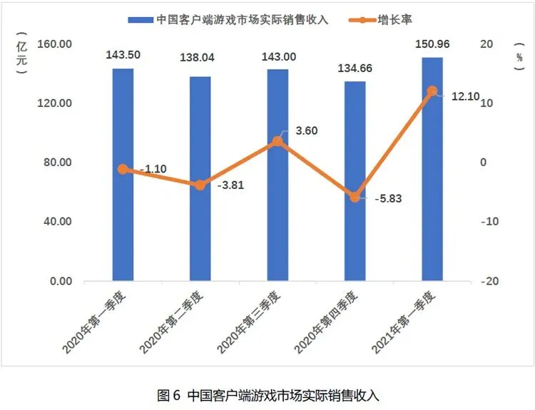 2021年第一季度,受元旦、春节假期的影响,用户的娱乐时间有所增长,客户端游戏需求旺盛,中国客户端游戏市场实际销售收入增长至150.96亿元,环比增长12.10%。