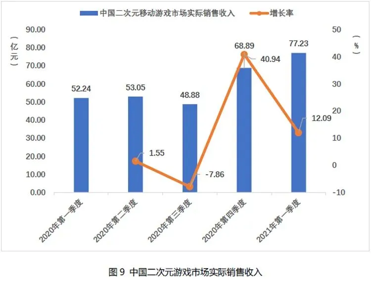 2021年第一季度,中国二次元游戏市场实际销售收入达77.23亿元,环比增长12.09%,二次元游戏市场依然存在较大发展潜力。