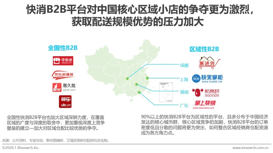 原因:从平台层面看,竞争不断加剧导致单个平台订单密度偏低,平台难以形成仓配规模优势快消品B2B行业马太效应加剧,行业整合形势不断加强。艾瑞咨询认为,快消B2B赛道上各方,尤其是具有优势地位的平台将进一步加大深耕式的竞争战略。2019年,第一梯队GMV在快消B2B行业的GMV比重预计将达60.6%,第二梯队比重将达27.6%。预计2020年,快消B2B行业第一梯队行业集中度将继续上升。行业竞争不断加剧导致单个平台订单密度偏低,平台难以形成仓配规模优势,导致仓配成本压力较大。原因:从门店层面看,订单分散、客单价低、对配送及时性要求高导致平台仓配成本压力大。现阶段90%以上的快消B2B平台为区域性的平台,且多分布于中国经济发达的核心城市群,快消B2B平台对中国核心区域小店的争夺更为激烈,小店主一般使用2个以上的快消B2B的APP,选择进货价格更低的快消B2B平台下订单。因此,现阶段多数快消B2B平台存在订单密度低且分散的现象,难以取得配送的规模优势。2019年,整体来看,小店的客单价不高,平均来看多在千元以下,并且对配送的及时性要求较高,这进一步加大了B2B平台的配送成本压力。建议:加强与供应链资源丰富、数字化建设、服务能力强的区域经销商合作。区域经销商的本地化服务能力较强。区域经销商的小店覆盖密度、在区域内长期积累的强大供应链组织能力以及与小店主的人际关系,拥有很强的竞争壁垒,快消B2B平台很难在短时间内建立起来。因此,区域经销商能够帮助快消B2B平台以更低的获客成本获取更多的存量客户,并且有助于降低快消B2B平台的配送成本,提高对小店的及时送货能力。同时,很多区域经销商也开始积极自我升级迭代,顺势而为,在数字化建设与服务能力上重建生存优势,这也进一步增强了快消B2B平台的合作意愿。零售终端