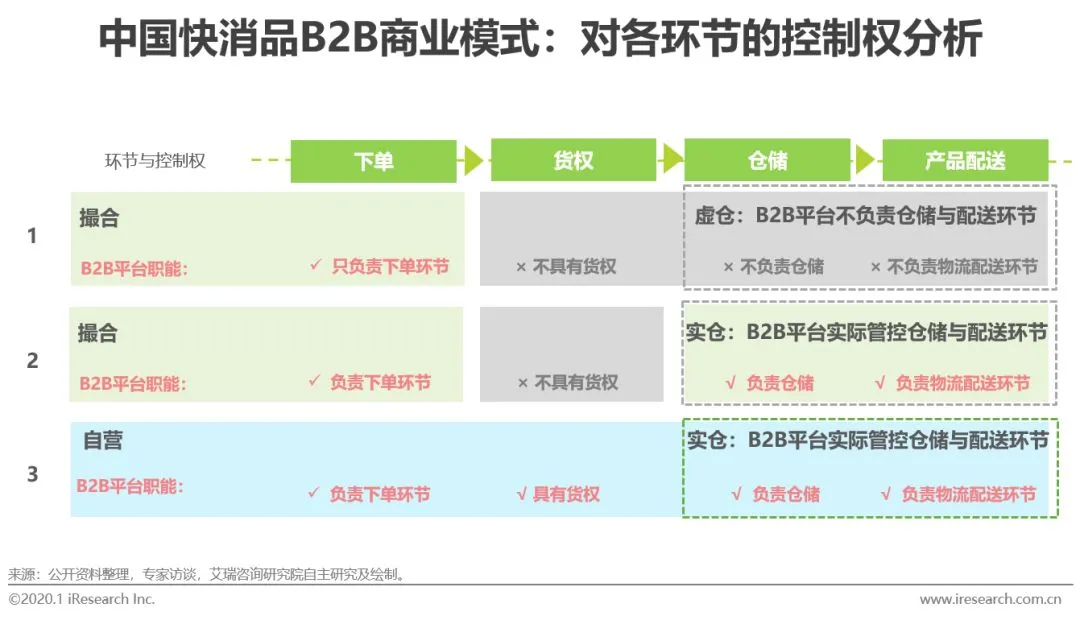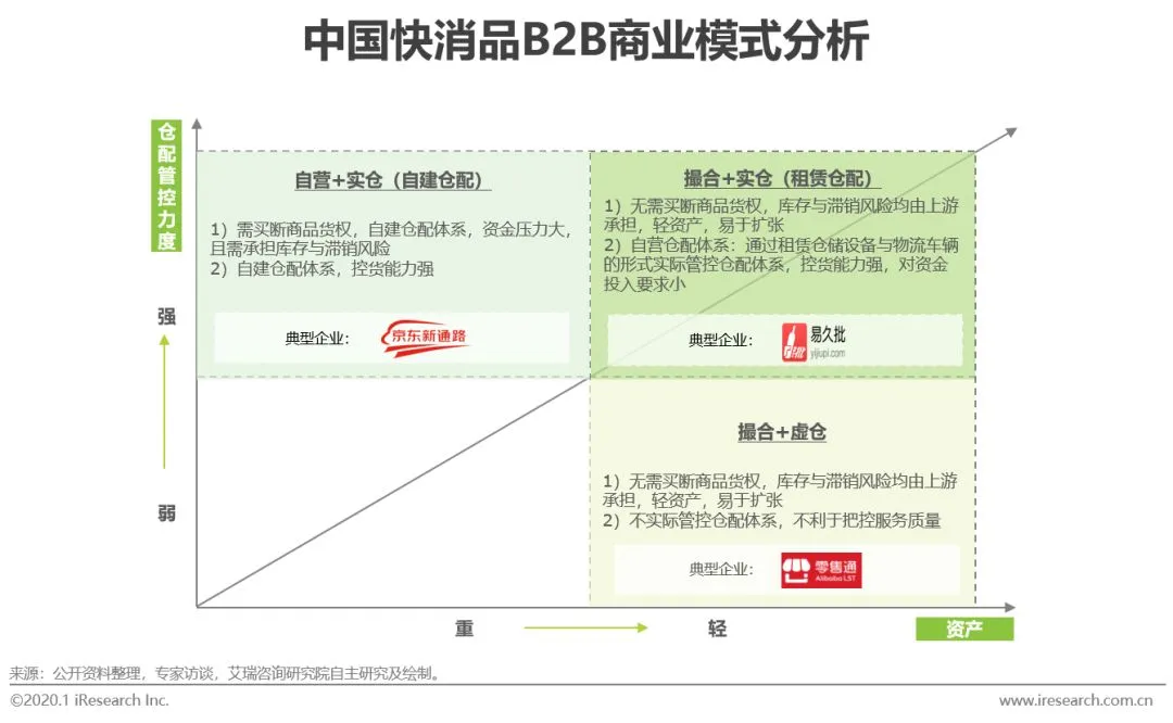 快消B2B对传统通路的升级改造体现三方面:1)实现了供应链全盘信息数据化可视化,可有效辅助上游品牌商进行产品分析、开发及营销;2)提升快消品仓配效率,减少资源浪费,降低运营成本;3)通过优化供应链,减少层层加价成本,帮助零售终端采购降本增效。行业进入理性发展期:头部企业的区域深耕能力更为重要。行业进入理性发展期,头部平台开始放缓对零售门店扩张速度,深耕区域供应链,加深与上游品牌商的合作深度,加强仓配体系建设,重点提升门店服务能力。快消B2B行业前进的方向是,快消B2B企业,尤其是头部企业将通过B2B产业互联网与B2C消费互联网的融合,争夺快消供应链竞争壁垒,提升客户体验,从而成为产业互联网时代下快消B2B行业的执牛耳者。2019年,中国快消品B2B市场交易规模预计将达到1980亿元。现阶段,快消B2B行业由高速发展期进入理性发展期,行业在经过跑马圈地的扩张后,各家开始回归精细化运营与盈利能力的比拼。目前小店从快消平台的进货金额占比较低,未来快消B2B平台仍有较大的渗透空间。全国来看,目前小店从快消B2B平台的进货金额在小店进货金额中占比约为5%,一二线城市小店从快消B2B平台的进货金额占比稍高,约为15%。未来随着平台对深耕现有市场,不断提升平台订单密度,降低配送成本,行业规模保持增长势头。艾瑞预计,2022年中国快消品B2B市场交易规模将达4428亿元。快消B2B平台可以根据货权与仓配环节管控权的不同进行分类。按照对商品是否具有货权,将快消品B2B平台分为自营模式和撮合模式。自营模式下,快消品B2B平台买断商品货权,通常自营仓储物流,实际管控仓配环节。撮合模式下,快消品B2B平台不具有商品的货权。按照是否实际管控仓配环节,将快消品B2B平台分为实仓模式和虚仓(云仓)模式。其中,实仓模式是指实际运营管控仓配环节,即快消B2B平台自营仓储物流,门店下单时,货物从平台的仓库发出,通过平台的物流体系进行配送。虚仓模式是指不实际运营仓配环节,即本地经销商的库存上线快消B2B平台,形成虚拟仓库,门店下单时,货物从原有经销商仓库发出,通过经销商原有的物流体系进行配送。撮合模式下,快消品B2B平台只负责下单环节,不具有商品的货权。B2B平台既可以采用实仓模式对仓配环节进行实际管控,也可以采用虚仓模式,即由经销商负责仓配环节。自营模式下,快消品B2B平台负责下单环节,具有商品的货权,且通常实际管控仓配环节。基于资产轻重与仓配管控力度强弱形成的三种模式,均有头部玩家跑通。实仓模式下,快消B2B平台实际管控仓配体系,具体有自建仓配与租赁仓配的两种类型。撮合与虚仓结合的模式对资金投入要求较小,但不利于把控供应链环节与服务质量;自营同时自建仓配的实仓模式可以严格把控全流程的供应链与服务质量,但对资金压力较大,影响扩张速度;撮合结合租赁仓储的实仓模式,既可以把控全流程的供应链与服务质量,又可以减轻对资金压力,利于B2B平台的快速扩张。中国快消品B2B行业的核心变化