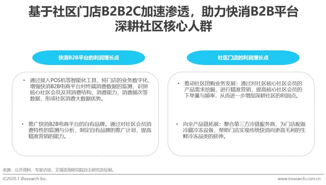 快消B2B平台的发展规范化与快消大数据建设的不断完善,将拉动品牌商合作意愿稳步提升。快消B2B头部企业引领行业进入规范化与深耕化的发展阶段,快消B2B平台对品牌方价格体系规则的遵守以及对区域消费数据的不断完善,将稳步提升品牌商与快消B2B平台合作意愿。品牌商通过电商渠道获取终端数据的布局加码,也将进一步强化两者的合作意愿。区域供应链数据资源的打通与前置仓建设的推进,将提高快消B2B平台对小店的渗透率。快消B2B平台将加快区域深耕化发展步伐,在前置仓与区域供应链大数据建设层面发力,降低配送成本,提高对门店的“最后一公里”的及时配送服务能力,以增加对门店的覆盖数量,提高快消B2B平台在门店进货渠道中地位。此外,部分区域经销商转型为快消B2B平台,与其他区域经销商抱团,充分利用区域的仓配资源,也将增强对小店的渗透率。基于社区门店的B2B2C加速渗透,助力快消B2B平台平台深耕社区核心人群。社区门店是优质的社区流量入口,聚集了大量优质的社区会员。社区会员消费结构、消费能力相对稳定,与社区门店之间信任感与互动能力较强,为快消B2B平台以社区门店为抓手,深耕社区核心人群,加速B2B2C渗透。这能够会为快消B2B平台和社区门店双方创造新的利润增长点。* 本文经艾瑞咨询(ID:iresearch)授权转载,转载请联系出处。* FBIF投稿与商务合作,联系Bobo(微信:fbifmedia1)/更多文章/