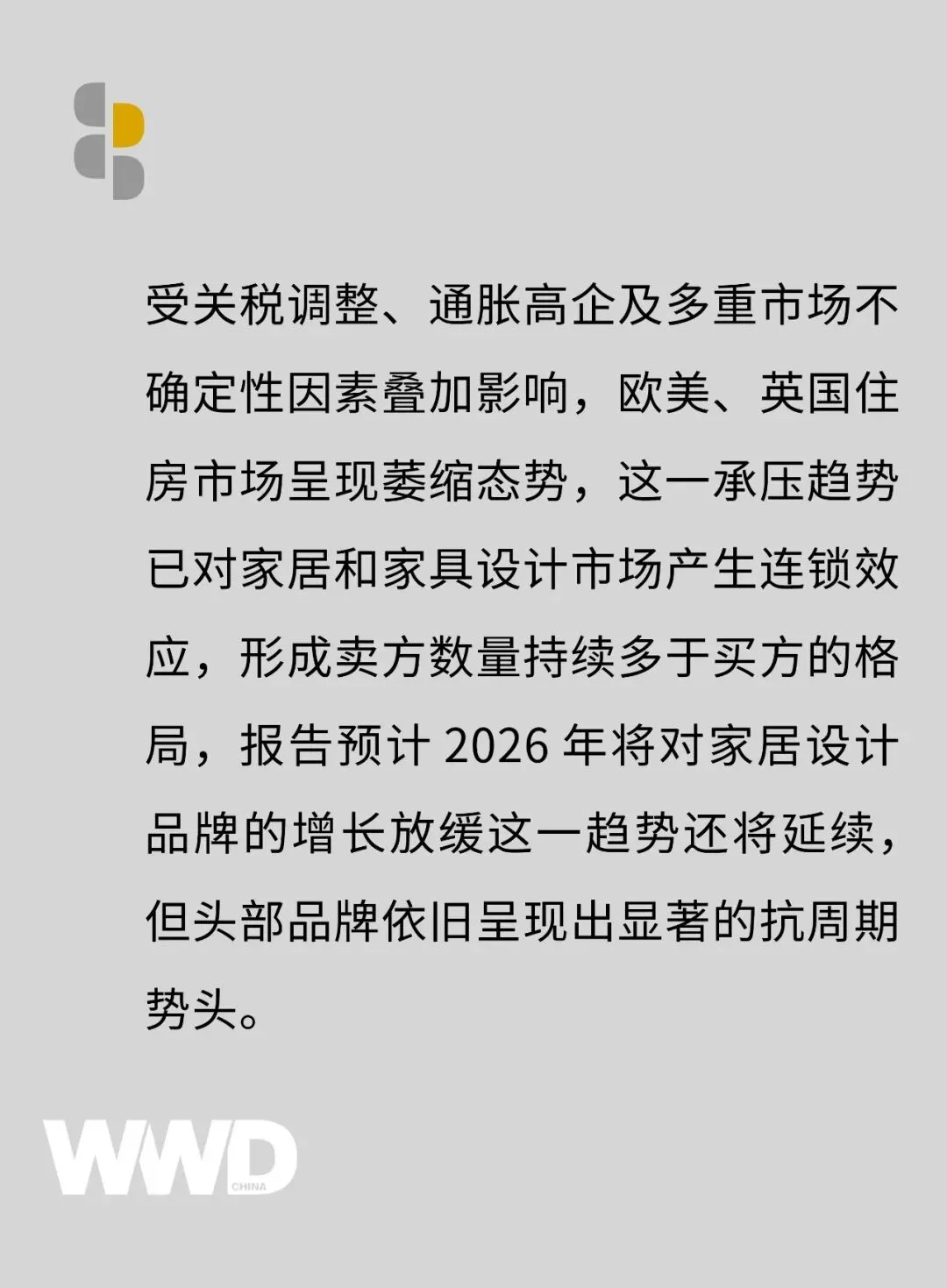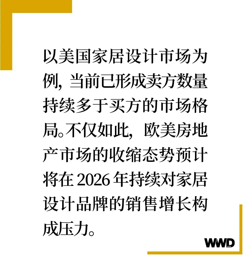 与此同时,包括家具和家居领域在内的设计市场,放缓趋势也随之蔓延。以美国家居设计市场为例,当前已形成卖方数量持续多于买方的市场格局。不仅如此,欧美房地产市场的收缩态势预计将在 2026 年持续对家居设计品牌的销售增长构成压力。