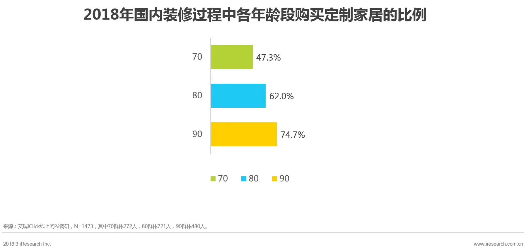在近两年有过装修或购买过家居的人群中,70群体购买定制家居的比例为47.3%,90群体购买的比例为74.7%