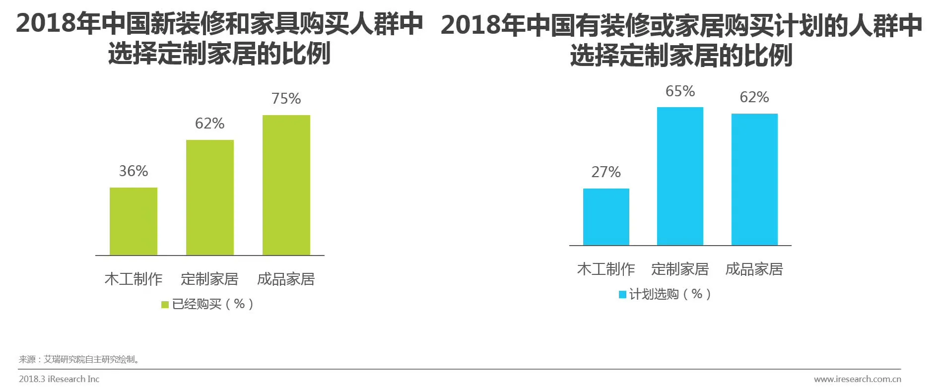 根据调研,近两年有过新装修或者购买过新家具的人群中,选择定制家居的人群比例达到62%,成品家居75%