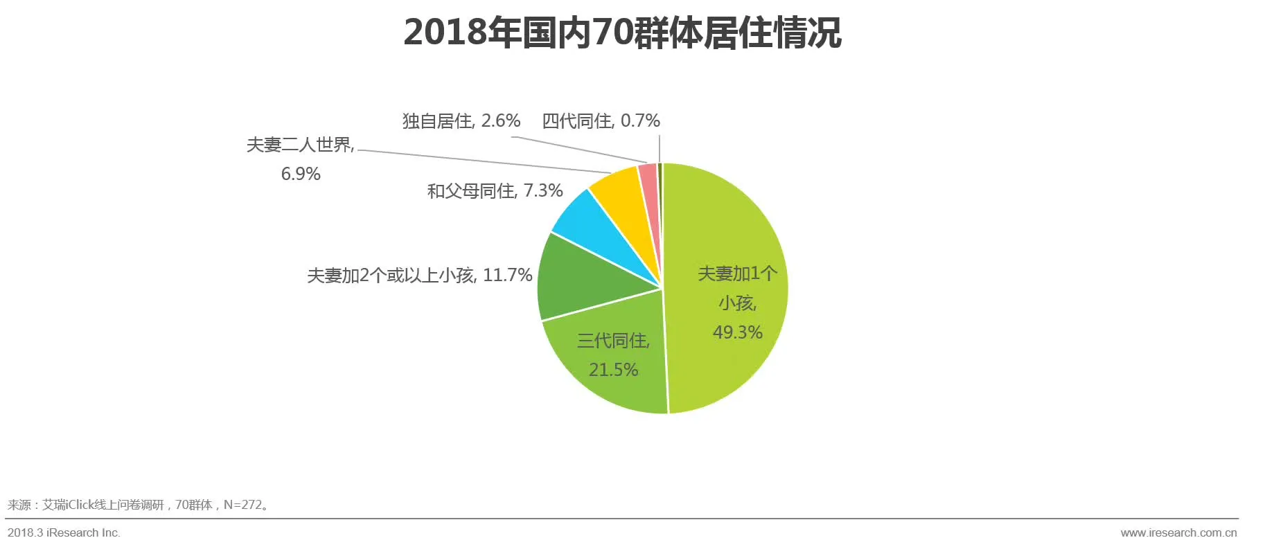 49.3%的70群体的居住情况是2+1家庭结构;21.5%的为三代同住。