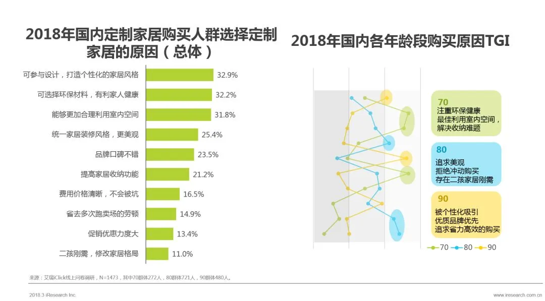 通过TGI的原因分析,70选择家居的原因:实用型,环保健康、最大化利用室内空间,解决收纳;80有二胎刚需,追求美观,价格敏感性;90后追求个性化和品牌,不愿意花太多精力在比价上。