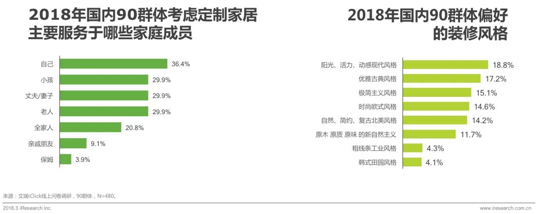 90群体尚未完全独立,33.3%和父母同住,有小孩的比例超过25.3%。36.4%的90考虑定制家居是出于自身的需求,说明90群体对定制家居的认可度较高,认可品牌,对价格无感。90群体偏好现代、古典风格。
