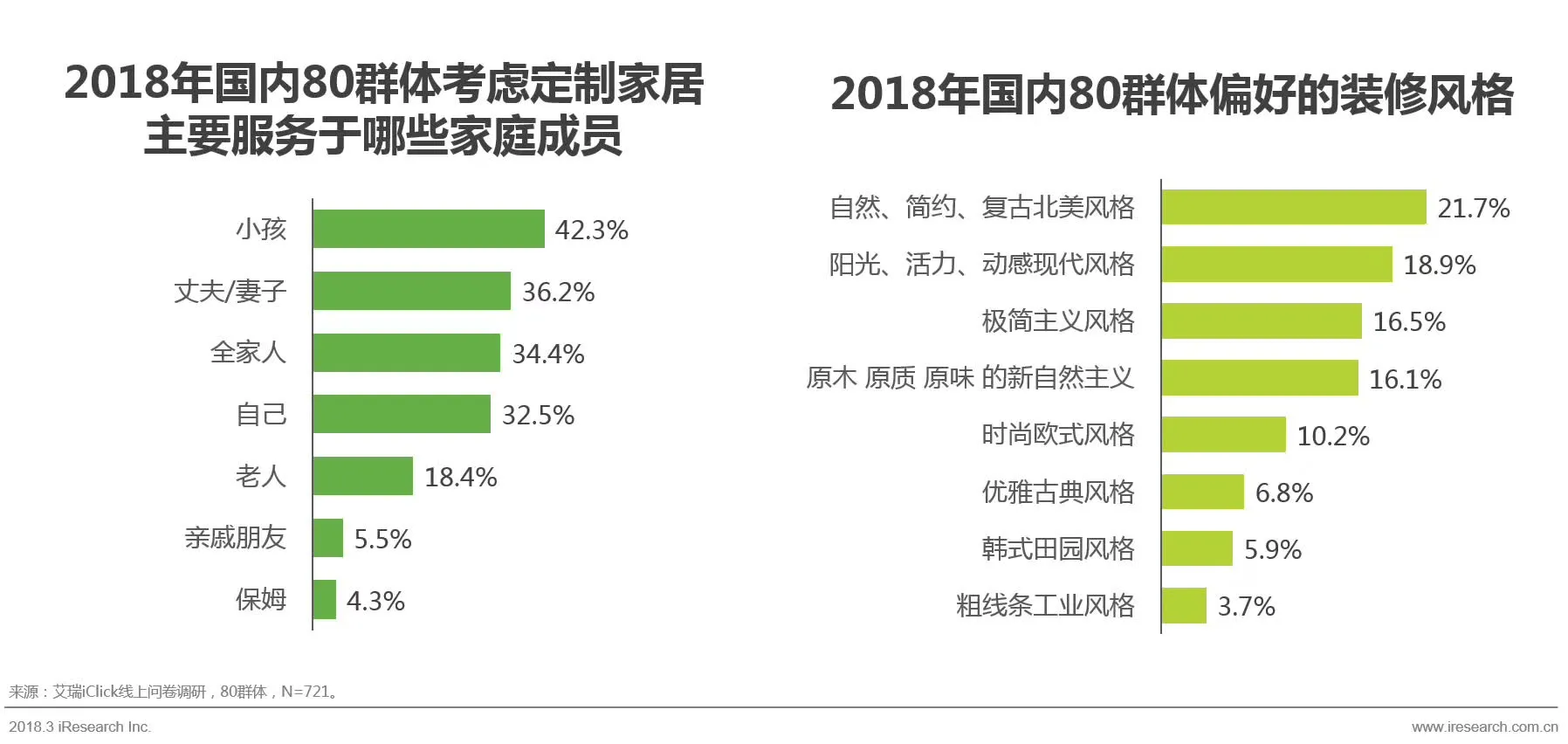 80群体中家中有小孩的比例约为71.6%,其中8.5%的有两个或以上小孩。80群体考虑定制家居主要是出于小孩的需求,其次为丈夫/妻子,价格敏感性。80群体偏好北美和现代风。
