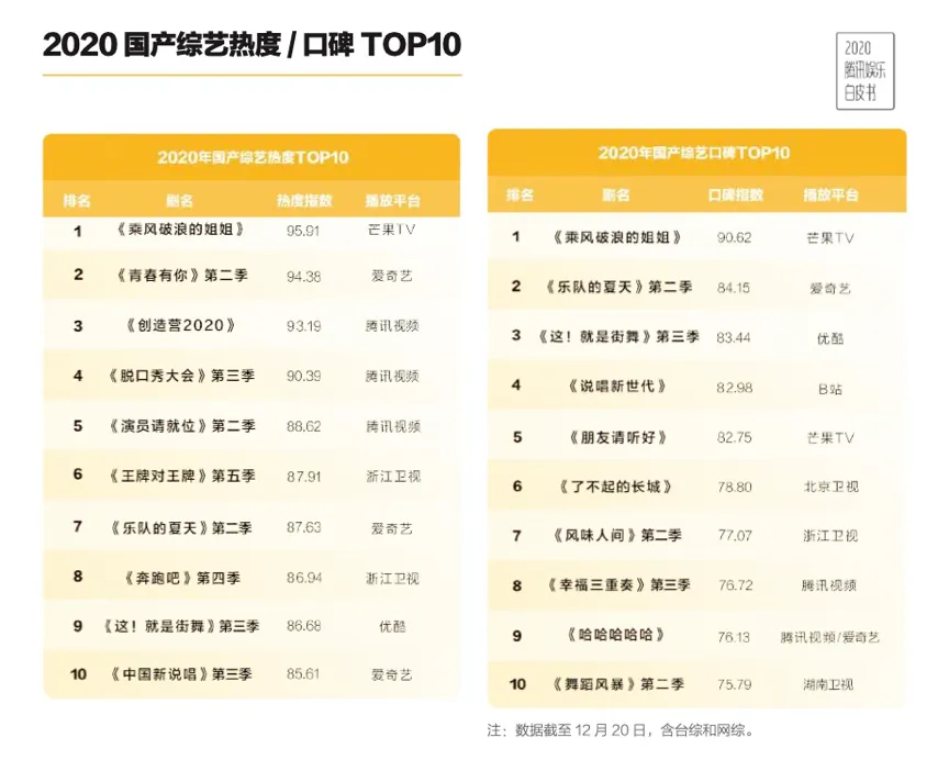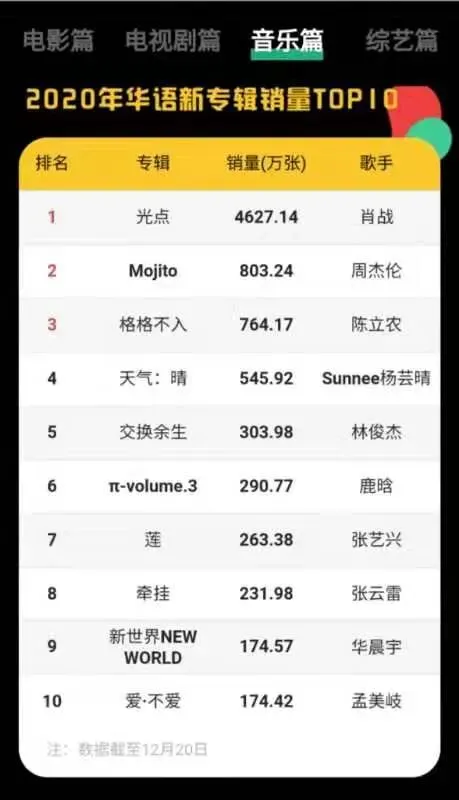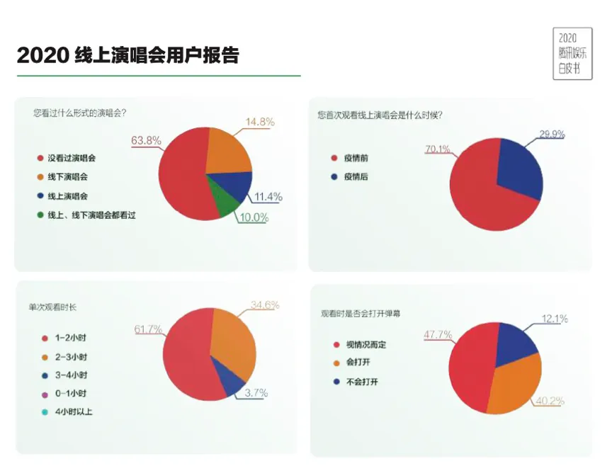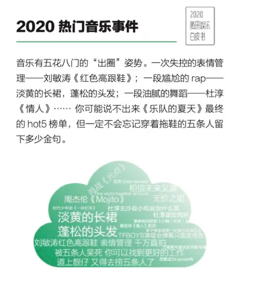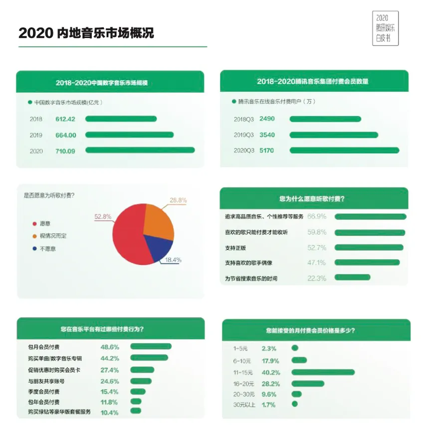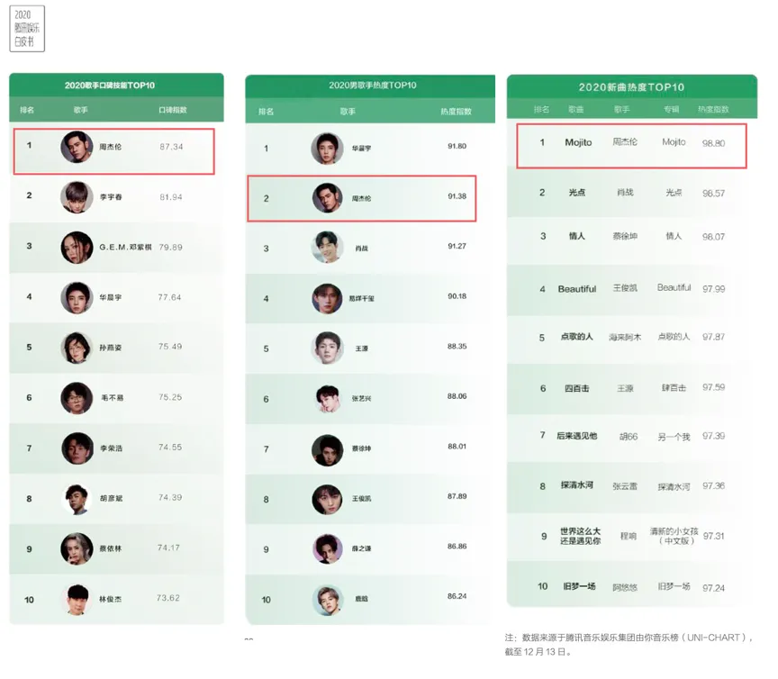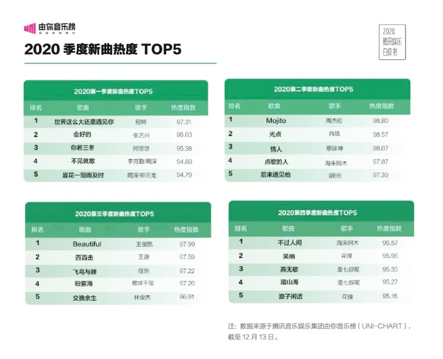 新仔按:本文原载于“2020腾讯娱乐白皮书”。尽管受到疫情的冲击,但2020年的中国音乐产业仍然步履未停。如果用一个字来概括2020年,可能是,难。突如其来的“黑天鹅”,打乱了全世界的阵脚,无数人的生活轨迹被改变,全行业受到冲击,音乐产业自然也不例外。不过,自2015年起,录制音乐产业的收入越来越依赖互联网,尤其是,中国的录音产业收入90%以上是数字收入,所以,相比于演出市场在疫情之下受到的沉重打击,互联网音乐平台、唱片公司等所受到的影响,相对要小一点。2020年前9个月,依靠流媒体收入持续高速增长,全球三大音乐公司环球、索尼和华纳均完成了增收,国内目前唯一在海外上市的互联网音乐公司腾讯音乐娱乐集团也实现了持续的盈利。互联网既是音乐产业的庇护所,也是音乐产业的新战场。随着线下活动的全面停摆,从音乐宣发到演出都转到线上,加速了线上音乐娱乐体验的发展——歌手把巡演开到了游戏里,AR、VR和全息投影被大量使用到直播里,一度发展受阻的付费直播,也开始被年轻用户们接受。在这个过程中,TME live等线上娱乐新品牌脱颖而出,未来的线上音乐娱乐市场,有望在大型互联网公司的重视下,获得进一步的焕新。在线上娱乐快速发展的同时,一个趋势从2019年延续到了2020年,那就是国内外“神曲当道”。在国内,《少年》、《惊雷》、《微微》、《无价之姐》等先后刷屏,《Last Dance》和《处处吻》等老歌翻红,在国外,一首《Baby Shark》创造了史上最高播放量MV的纪录,费玉清的《一剪梅》也在国外社交媒体上爆红。在2020年,影响力能跟社交短视频一较高下的,可能是网络综艺。《说唱听我的》制造了热点“魔动闪霸”,《说唱新世代》成为Z世代(95-00后)津津乐道的谈资,《明日之子:乐团季》和《乐队的夏天第二季》等乐队节目带动“乐队热”,《乘风破浪的姐姐》引发了关于“全开麦”的大讨论。直播、短视频、综艺等多管齐下,让2020年的音乐市场尽管受到疫情冲击,但仍然很热闹。只不过,热闹有余,精彩不足。新媒介的乱战、新流量的造圈、新说唱的崛起、新话题的热议,都只是加固互联网发展至今所发展出来的圈层化趋势。短视频神曲走俏网络的同时也招致种种非议,流量歌手的数字专辑破纪录却仅局限于粉圈的自嗨,音乐综艺节目的火爆到头来也仅止于热搜,而并没有沉淀出优秀作品。“破圈”两个字,各种圈从年头喊到年尾,最后一合计,2020年里,大众最津津乐道的歌手还是那个男人——周杰伦。《2020腾讯娱乐白皮书》显示,无论口碑、热度、歌曲,周杰伦都名列前茅好消息是,自2015年起,音乐市场止跌回升,行业活力再现。2020年第三季度,腾讯音乐的在线音乐服务付费用户量达到创纪录的5170万,付费率达8%。而且,Z世代的付费意愿走高,这为来年的音乐市场留下了新的希望——或许,在付费刺激下,好内容的出现只是时间问题。2020年12月11日,TME live宣布,将在12月31日晚直播张惠妹的跨年演唱会,这场演出既为2020年划上一个句号,也是2020年音乐市场变化的一个“注脚”。如果没有疫情发生,2020年本来会是一个现场演出的大年。陈奕迅、周杰伦、蔡依林、孙燕姿、五月天等歌手均计划举办大型巡演。然而,一场疫情,打乱了所有人的计划,线下演出纷纷取消或延期。中国演出行业协会3月2日晚发布的消息称,据不完全统计,3月份全国20余省市,近8000场次演出(包含剧场和大型演出)被取消或延期。线下演出市场陷入困境。演出数据服务商Pollstar发布年度报告称,受疫情影响,2020年,全球演出市场损失高达300亿美元。直播成为行业自救的重要选项。陈奕迅、孙燕姿、五月天、刘若仪、TFBOYS、Billie Eillish等艺人纷纷把演唱会开到了线上。Travis Scott等国外音乐人还尝试了在视频游戏里举办巡演,线上音乐现场空前火爆。