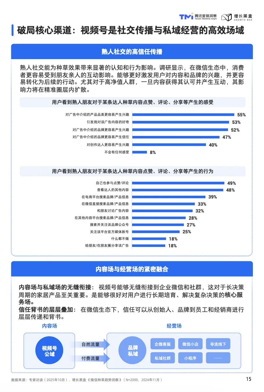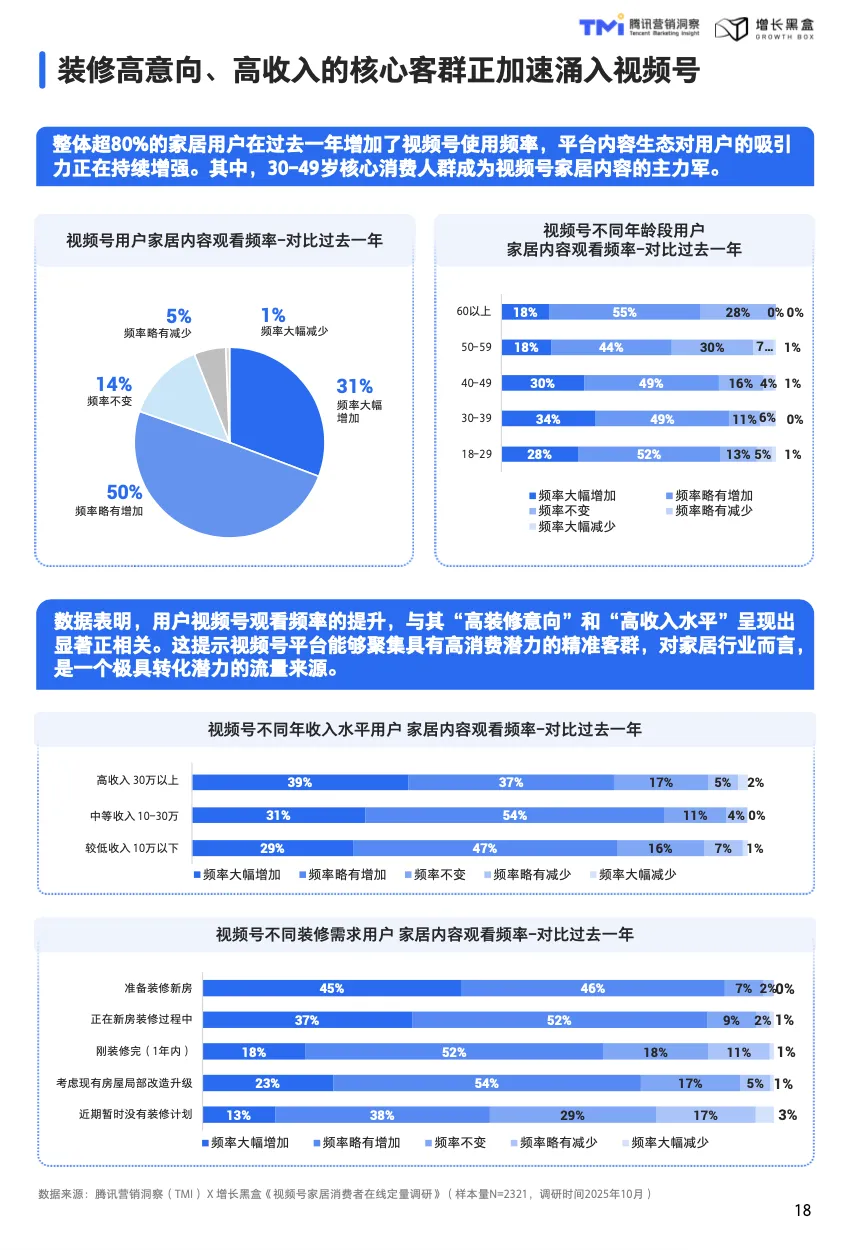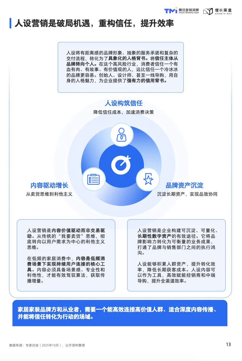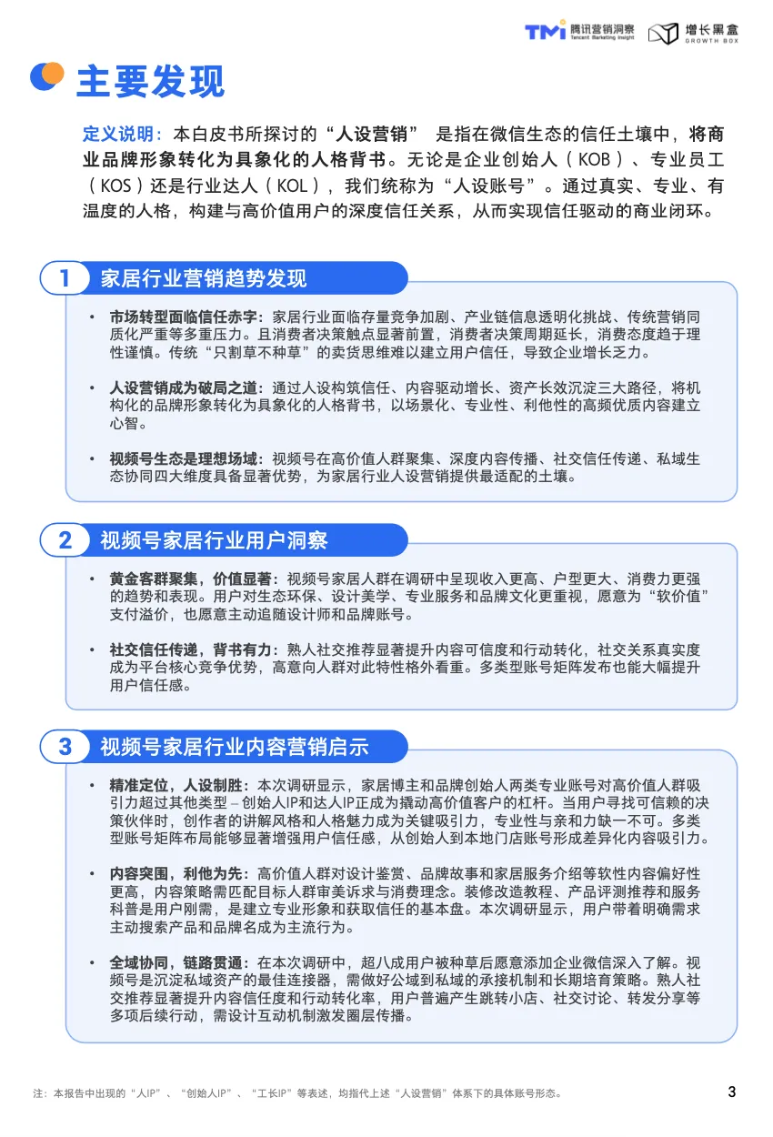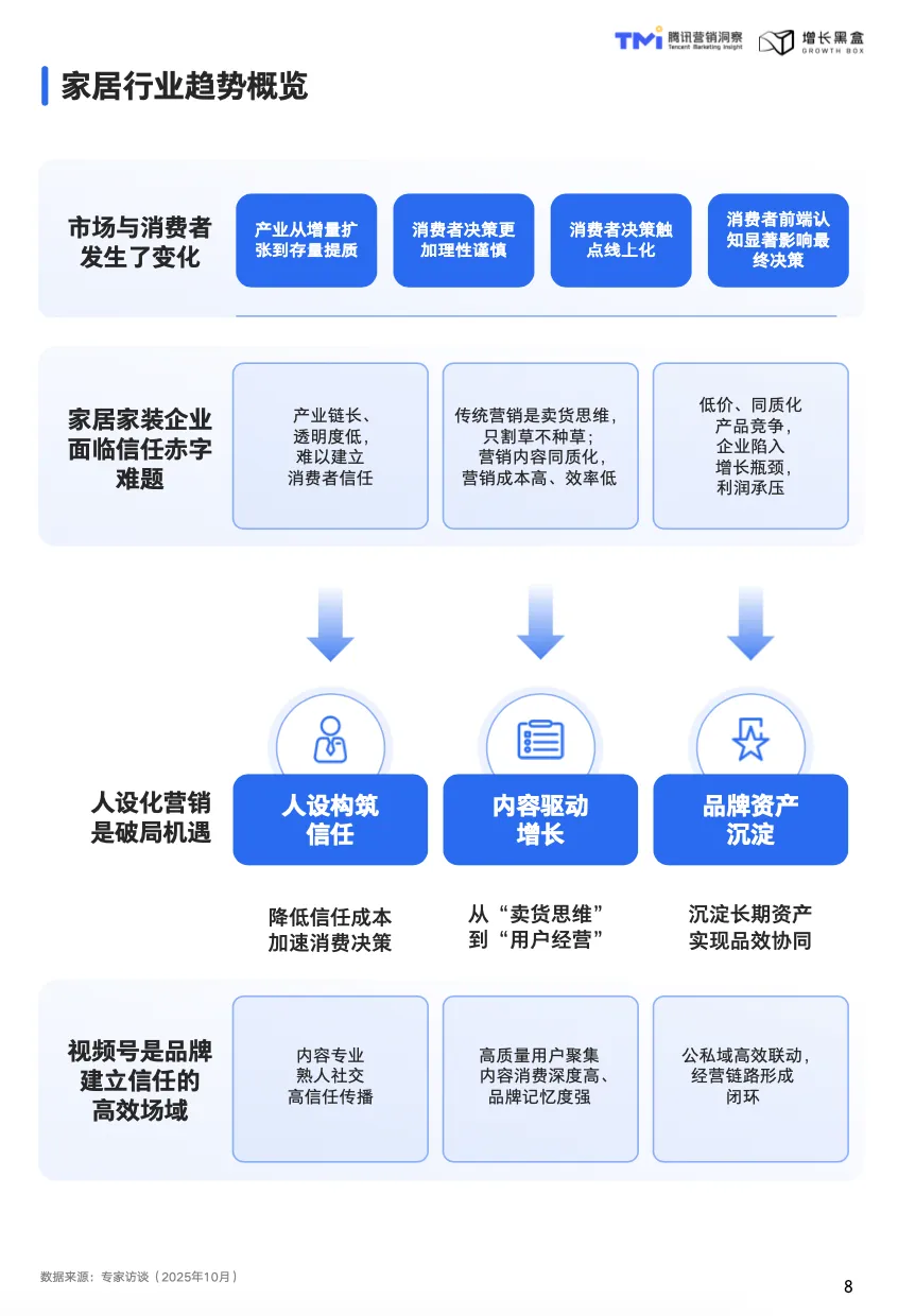 本报告揭示的核心是:以“人设”为媒介的深度关系经营,已经成为#家居行业 营销的新机会点。微信生态,凭借其独特的社交土壤与公私域闭环,正成为家居品牌破解信任难题、连接高价值人群的关键场域。#视频号 让专业内容得以在信任关系链中高效流转,无论是创始人、设计师、工长还是美学博主,这些真实、专业、可信赖的人设,正以人格化内容穿透信息噪音,为品牌提供可持续的信用背书。