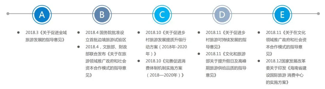 从2018年旅游相关政策可看出,在改革开放进一步深化的条件下,政府端对旅游产业空间、业态发展、公共服务建设等方面的关注度逐渐增强,其中,在政策内容中关于全域旅游、乡村振兴、智慧旅游、旅游厕所、自驾车旅、体育旅游等新业态领域内容重点强调。
