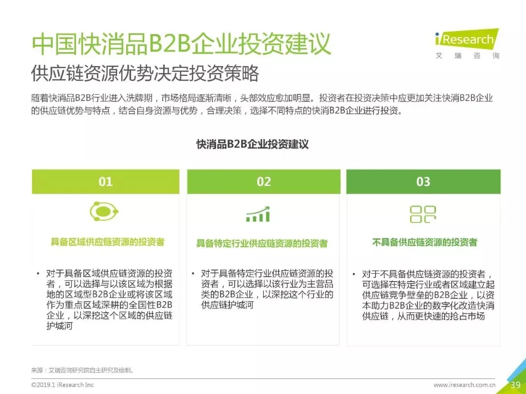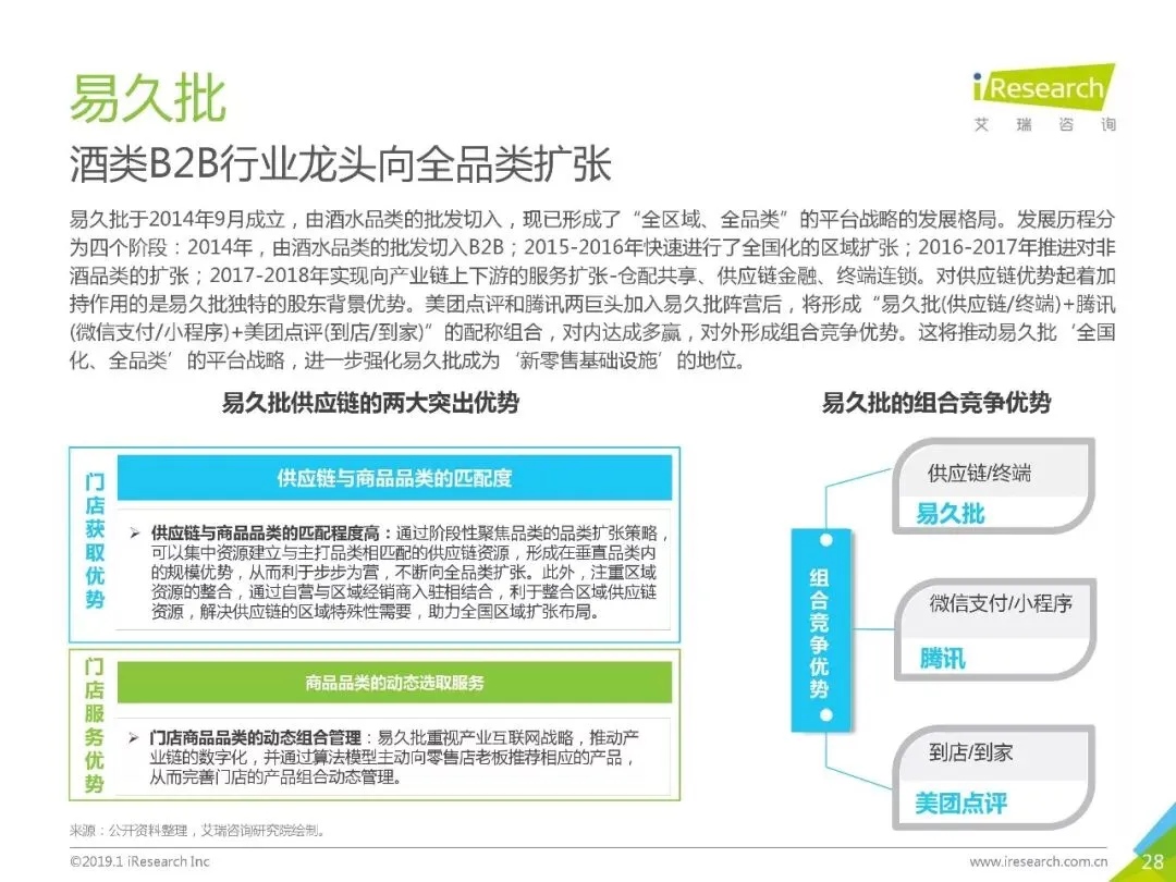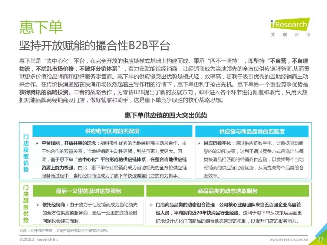 导读:《2019年中国快消品B2B行业发展研究报告》报告在中国快消品B2B行业发展现状以及中国快消品B2B企业服务能力评价体系的研究基础上,剖析了典型企业的突出竞争优势以及行业发展趋势,并进一步地为行业从业者的经营决策,以及投资者的策略制定提供了可资参考的建议.